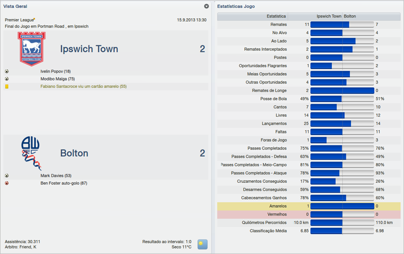 Outubro começou com a importante partida contra o PSV, pela Europa League. Uma vitória nos colocaria em uma excelente posição para a classificação, mas não sabia o que esperar dos holandeses. Quando a bola rolou, o Ipswich se portou muito bem, sempre com mais posse de bola e mais arremates. O 1º tempo seguiu no 0 a 0 e estava preocupado, quando Darron Gibson fez mais um de seus gols de fora da área. Para o 2º tempo, decidi modificar a formação e usei três atacantes centralizados e um meio-campo em um losango aberto. Gostei do que vi. Faltaram gols é verdade, mas fizemos 19 arremates ao todo, com quatro chances claras de gol e 58% de posse de bola. Na outra partida do grupo, mais um resultado excelente para o Ipswich, já que o Basel não saiu de um empate em 0 a 0 contra ao Karparty.