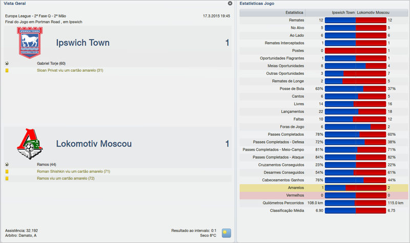 A partida de volta contra o Lokomotiv não foi tão boa para o Ipswich. Jogamos com o regulamento embaixo do braço, enquanto o adversário especulava em busca do gol. Foi assim, que em um chute de fora da área, eles abriram o placar. A derrota parcial poderia se transformar em algo mais complicado se o Lokomotiv fosse mais ousado. Voltaram para o 2º tempo em um 5-2-3, mas sofreram o empate e o 1 a 1 garantiu nossa classificação.