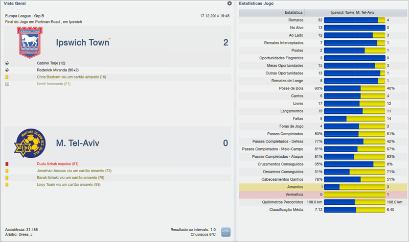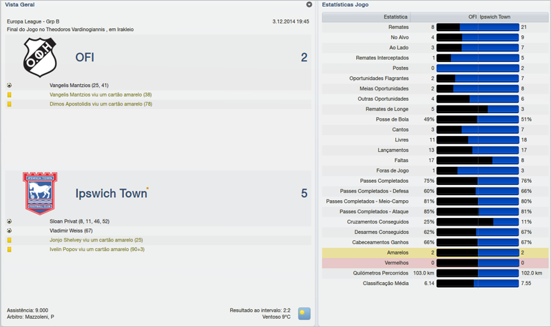 Antes da partida contra o Metalist enfrentamos o Wigan, fora de casa. Fizemos uma partida de raça e que me deixou muito feliz. Aos 2 minutos de partida, Torje foi expulso aos entrar com os dois pés juntos no adversário. Mesmo inferiorizado, optei por não mudar a formação, deixando o time sem um extremo-direito. Ficamos sem a posse de bola, que terminou em 62% para o Wigan, mas conseguimos equilibrar o número de arremates e para minha alegria, mesmo com 10 em campo, derrotamos o Wigan por 2 a 0.