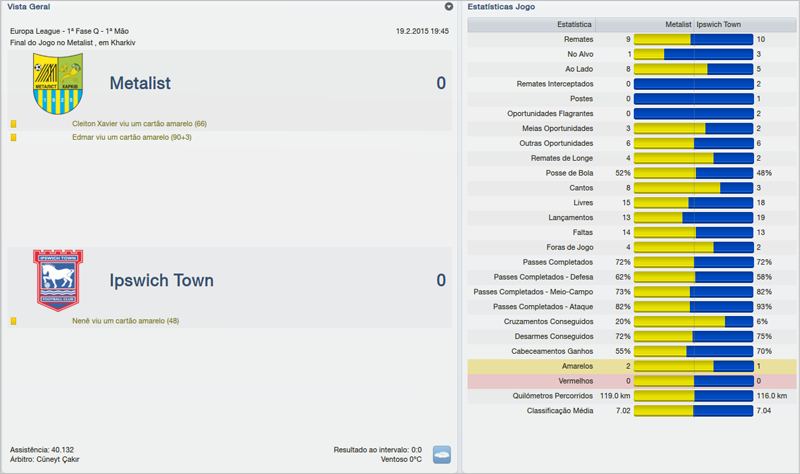 Para a partida contra o Metalist, fora de casa, levei o time titular. A partida foi bastante equilibrada em Kharkiv. O goleiro adversário foi o melhor em campo e tivemos duas chances claras de gol, mas o empate em 0 a 0 foi o mais justo. Um bom resultado para o Ipswich.