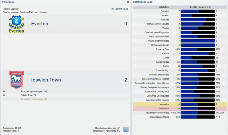 A última partida do ano foi sob chuva. No Goodison Park, estádio do Everton. Contra os Toffies a partida foi bem equilibrada, mas conseguimos, com calma fazer o gols e vencer por 2 a 0.