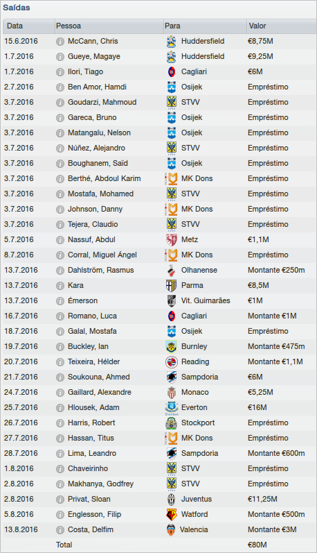 Para a temporada 2016/17 recebi 55 milhões de euros para transferências e tive que tomar uma decisão sobre a permanência de outros jogadores no elenco. Além do Hlousek e Soukouna, decidi que outros jogadores seriam negociados, como foram os casos de Chris McCann, Magueye Gueye, Tiago Ilori e Sloan Privat. Outros jogadores que não estavam no elenco principal também foram negociados em definitivo e por empréstimo. Aos todo arrecadei 80 milhões e gastei 88 milhões. Ainda tenho 27 milhões para contratações e guardarei para contratar jovens ou para um jogador de maior renome.