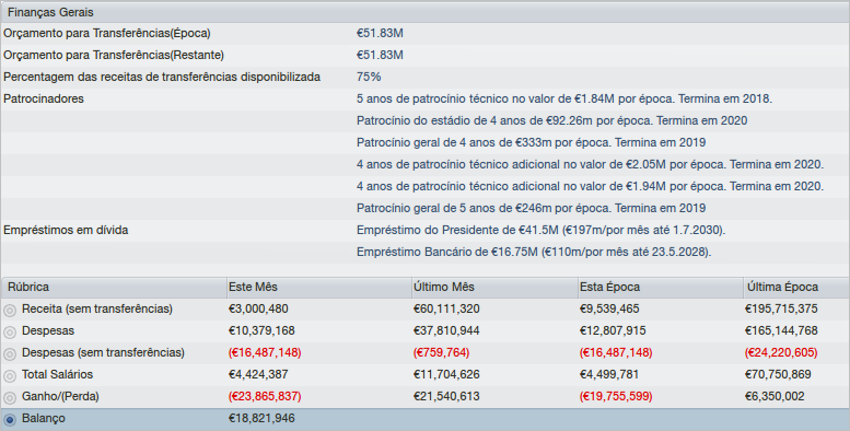 Além de não ter como aumentar as receitas, os custos do clube aumentarão ainda mais, pois a Diretoria aceitou um pedido meu e construirá um novo estádio, que terá capacidade de 54 mil espectadores, 14 mil a mais do que a atual. Infelizmente a construção durará duas temporadas e somente na temporada 2018/19 poderei usá-lo.