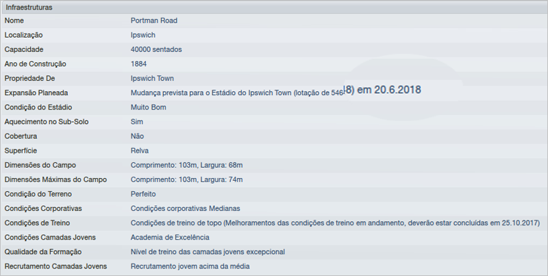 • Estruturalmente, eu tenho procurado evoluir o clube desde o início do save e a “menina dos olhos” é o novo estádio do Ipswich, que está em construção e ficará pronto, não sei bem ao certo, se em junho de 2018 ou setembro de 2019 e que promoverá o aumento das receitas do clube.