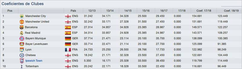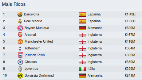 • Existem quatro clubes com reputação mundial: Barcelona, Manchester United, Bayern Munique e Real Madrid. Abaixo deles existem os clubes de reputação continental e o Ipswich já é o segundo da lista, atrás apenas do Chelsea.
