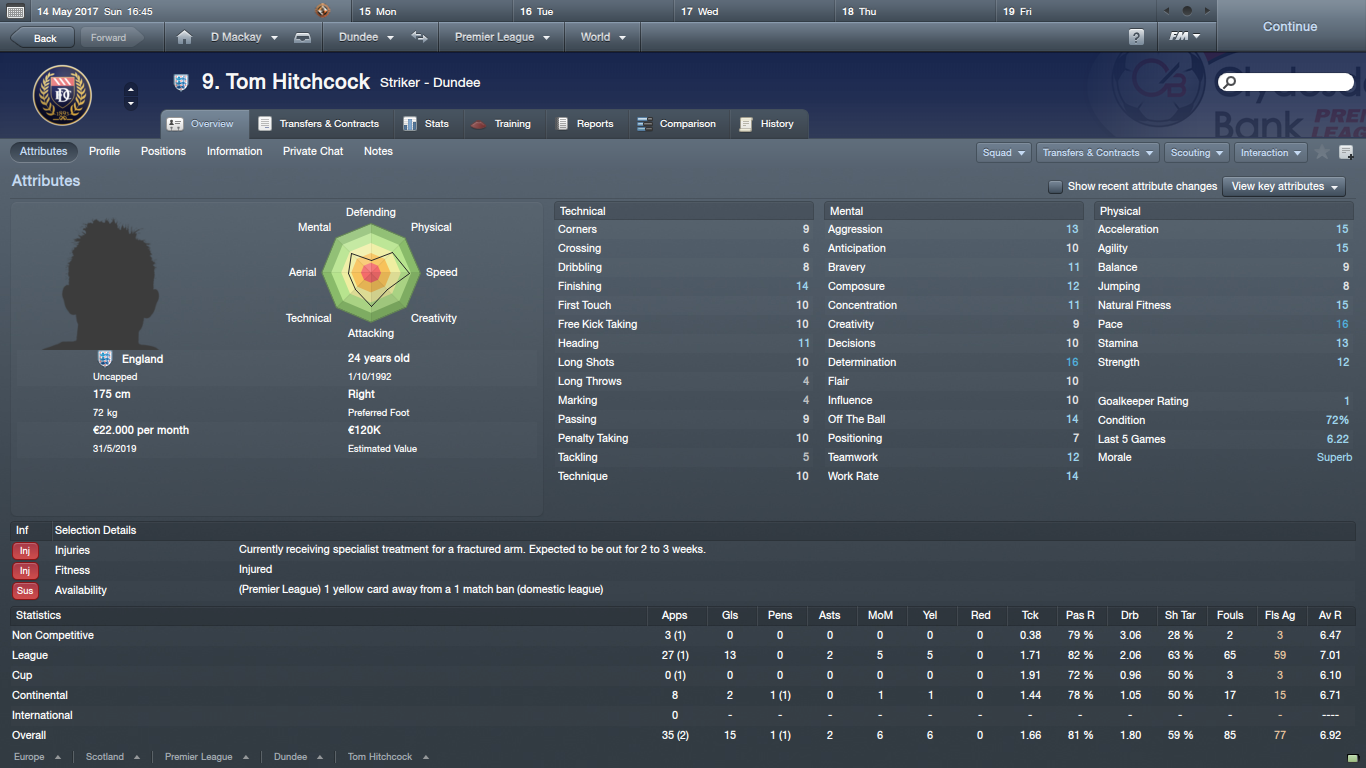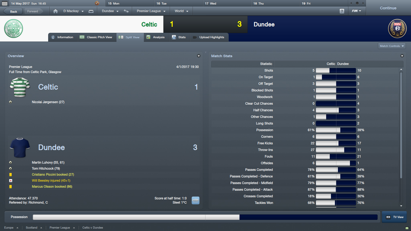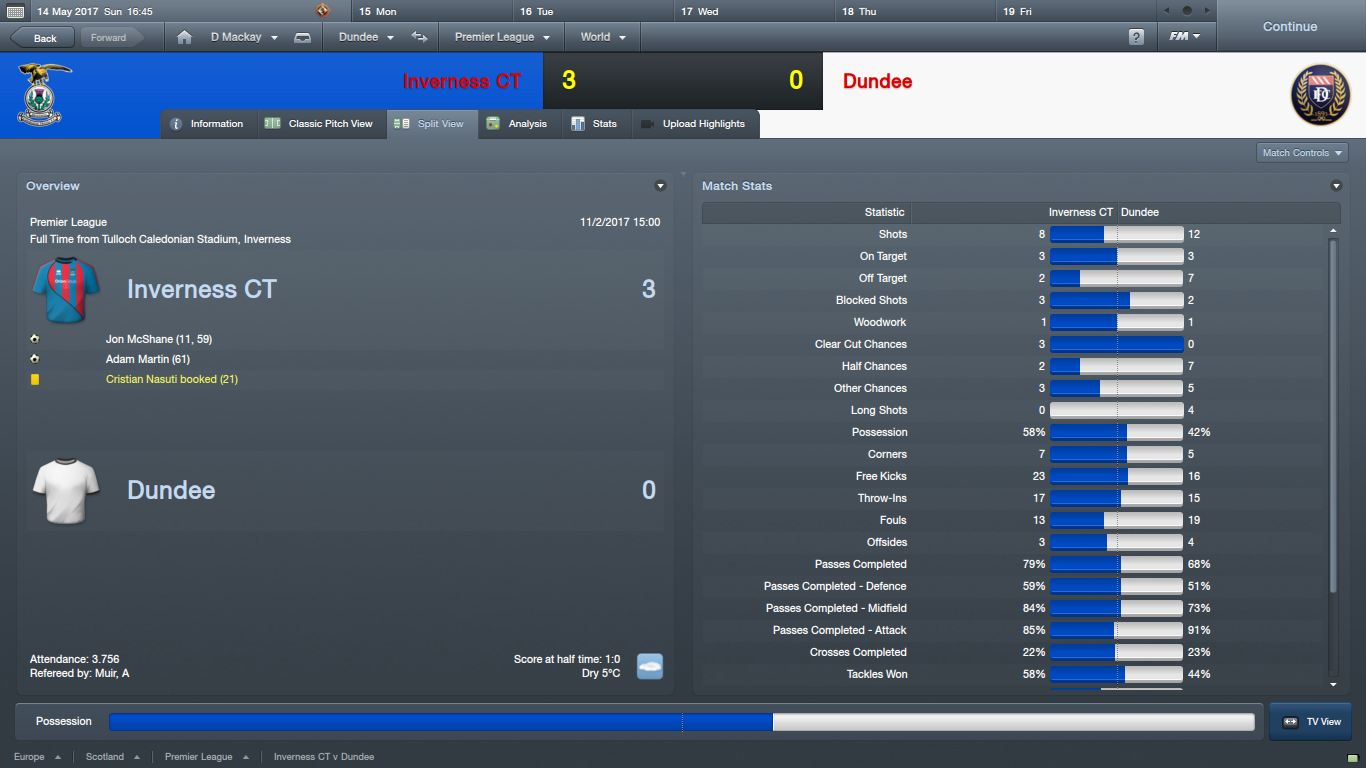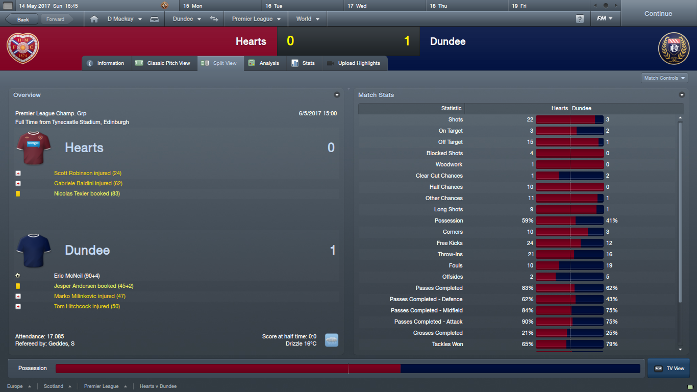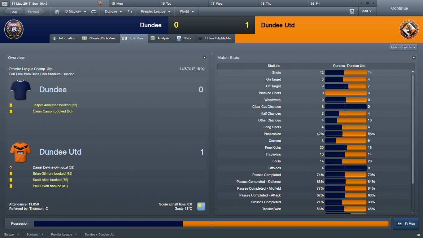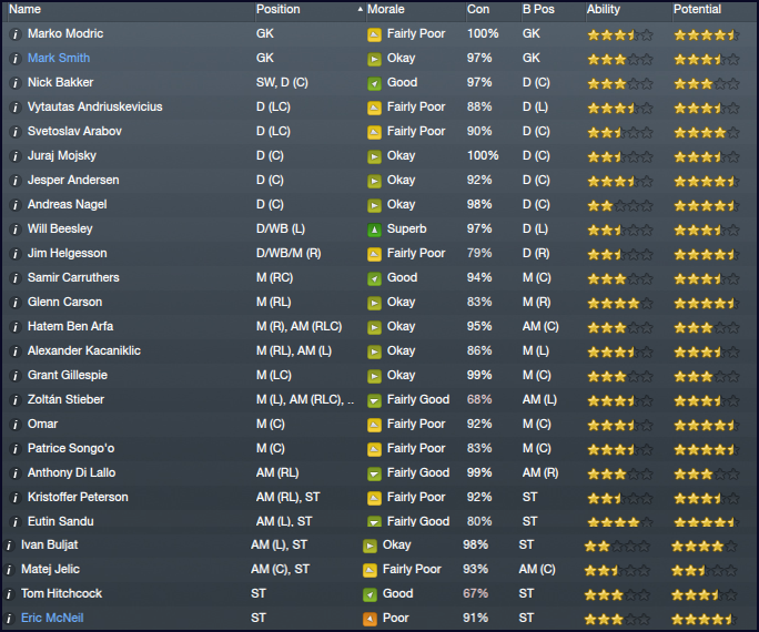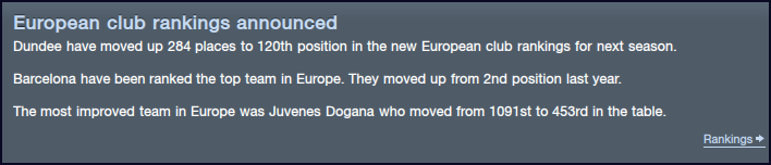 As coisas vão meio atribuladas na minha vida, contudoo vamos falar o que a temporada passada do Dundee causou para ele no mundo do futebol, inicialmente,a equipe subiu muitas posições no ranking da UEFA, se tornou uma equipe com uma reputação maior dentro da Escócia, porém, contou com o azar, justamente no ano que foi campeão, a Escócia perdeu a vaga direta para a fase de grupos da Champions League, logo, esse era um revés não contado. Prosseguindo, achei que seria ousado demais dizer a diretoria que seríamos bicampeões, por isso preferi dizer que disputaríamos o título novamente. Por fim, trouxe alguns jogadores, para a equipe, a fim de montar um elenco diferente, algumas peças já estavam saturadas no Dundee e mesmo não querendo perdê-las achei que era hora para iniciar uma nova geração, capaz de fazer um Dundee mais forte continentalmente. Essa decisão minha teve uma consequência drástica, mas explico depois.