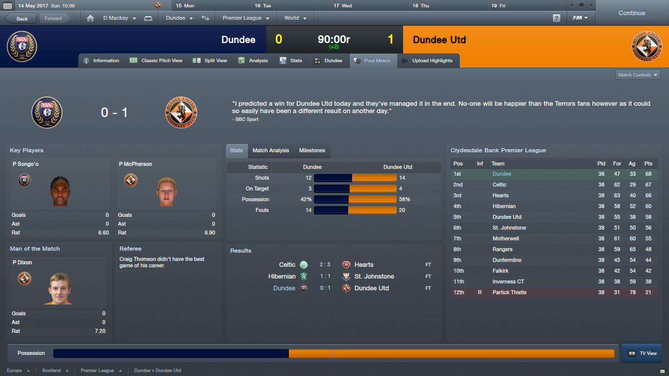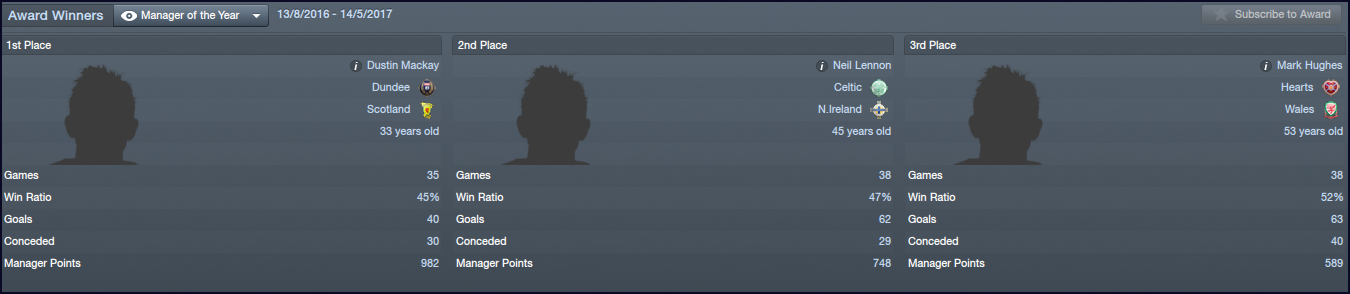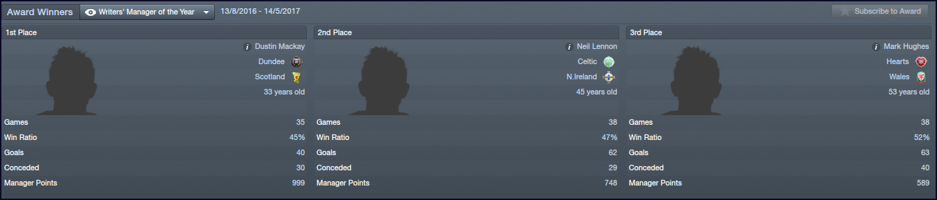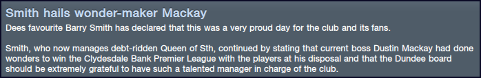 Com o campeonato conquistado, acabamos recebendo adulação de diversos lados, mas o que importa mesmo é que somos reconhecidos por isso, a imprensa, a diretoria e até pessoas que também fazem parte da história do Dundee falarem de mim em público é muito bom, mas o melhor mesmo foi ter ganhado os dois prêmios de treinador do ano na Escócia, o que significa que estou no caminho certo para superar Willie Maley e Sir Alex Fergunson.