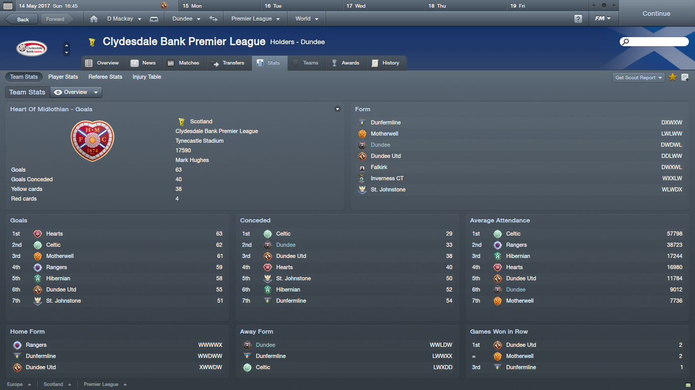 Foi um final de temporada bizarro, principalmente pelas surpresas que a última rodada me reservou. Mas o que importa é que após 55 anos, voltamos a reerguar a taça máxima do futebol escocês e nos sagramos campeões. Apesar de termos perdido na última rodada, contamos com a derrota de virada do Celtic, dentro de casa, para o Hearts, que marcou o gol da vitória aos 89 minutos de jogo. Acho que foi o destino, era realmente a nossa hora de ganhar, até quando as coisas deram errado para nós, a sorte nos ajudou e conseguimos o bicampeonato nacional, superando assim nosso rival local, novamente. E sabe o que é melhor, nos ultimos anos ficou 3 vezes entre os 3 melhores, a gente na primeira vez que fica entre os 3 melhores, somos campeões, talvez seja essa nossa diferença. E só para marco de curiosidade, com nossa conquista a Old Firm viu seu recorde de 30 anos ir por água abaixo, a última conquista foi em 1985, do Aberdeen com o comando do lendário Sir Alex Fergunson. Espero que isso seja algum tipo de prenuncio.