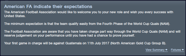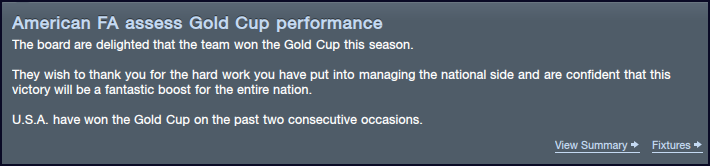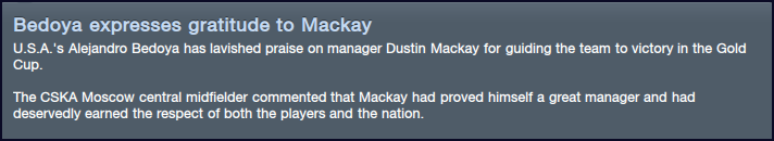 No mercado de trabalho, as coisas andavam bem para mim, mas só que na Ucrânia, três equipes de lá mandaram seus treinadores embora e a imprensa me colocou como favorito para assumir o cargo no Shakhtar, Metalist e Metalurg. Neguei qualquer interesse dessas equipes, o que era verdade, ninguém tinha me procurado, mas mesmo se tivesse, não aceitaria, não seria bom para o meu plano de carreira dentro do mundo do futebol, já que ainda não tenho planos de abandonar a Escócia e talvez ainda vá demorar alguns longos anos para isso. Por fim, a mais surpreendente proposta de emprego que já recebi. Subitamente, no dia 2 de julho, Jürgen Klinsmann decidi se aposentar e isso era a apenas poucos dias do início da Copa Ouro no Estados Unidos, o mesmo já havia convocado sua seleção para defender o título na Copa Ouro, e subitamente, ele anuncia o fim de sua carreira. Então a Federação Americana de Soccer, http://i255.photobucket.com/albums/hh132/henrimelo/DustinMackayNews_Inbox-7-3.png]decidiu me convidar a assumir seu lugar, coisa que prontamente aceitei, pois seria minha chance de disputar uma Copa do Mundo em menos de 8 anos de carreira. Com isso, me tornei técnico da seleção estadosunidenses de futebol e logo de cara já teria a Copa Ouro pela frente.