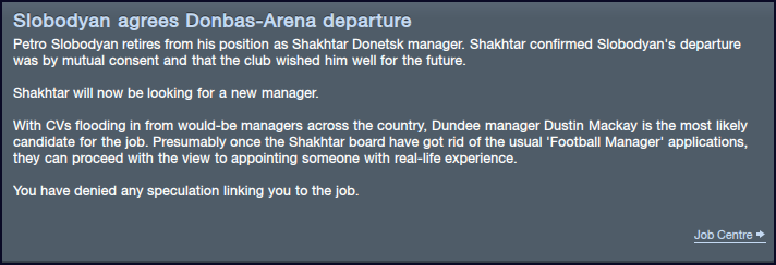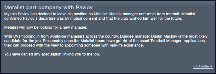Por fim, durante o começo desse ano sobrevive a troca de diretoria, uma situação não muito agradável, que dependendo de quem assume, seu emprego vai pro saco, no caso, assumi um antigo membro da diretoria, que conhecia meu trabalho e sabe do que sou capaz, foi bastante educado comigo após ter assumido a presidência dos Dees. Por fim, renovei meu contrato com o Dundee por mais um ano, a contragosto, é verdade, queria ter ido para o Rangers, quando eles trocaram de treinador, mas como eles não me quiseram, preferi não trocar o certo pelo duvidoso.