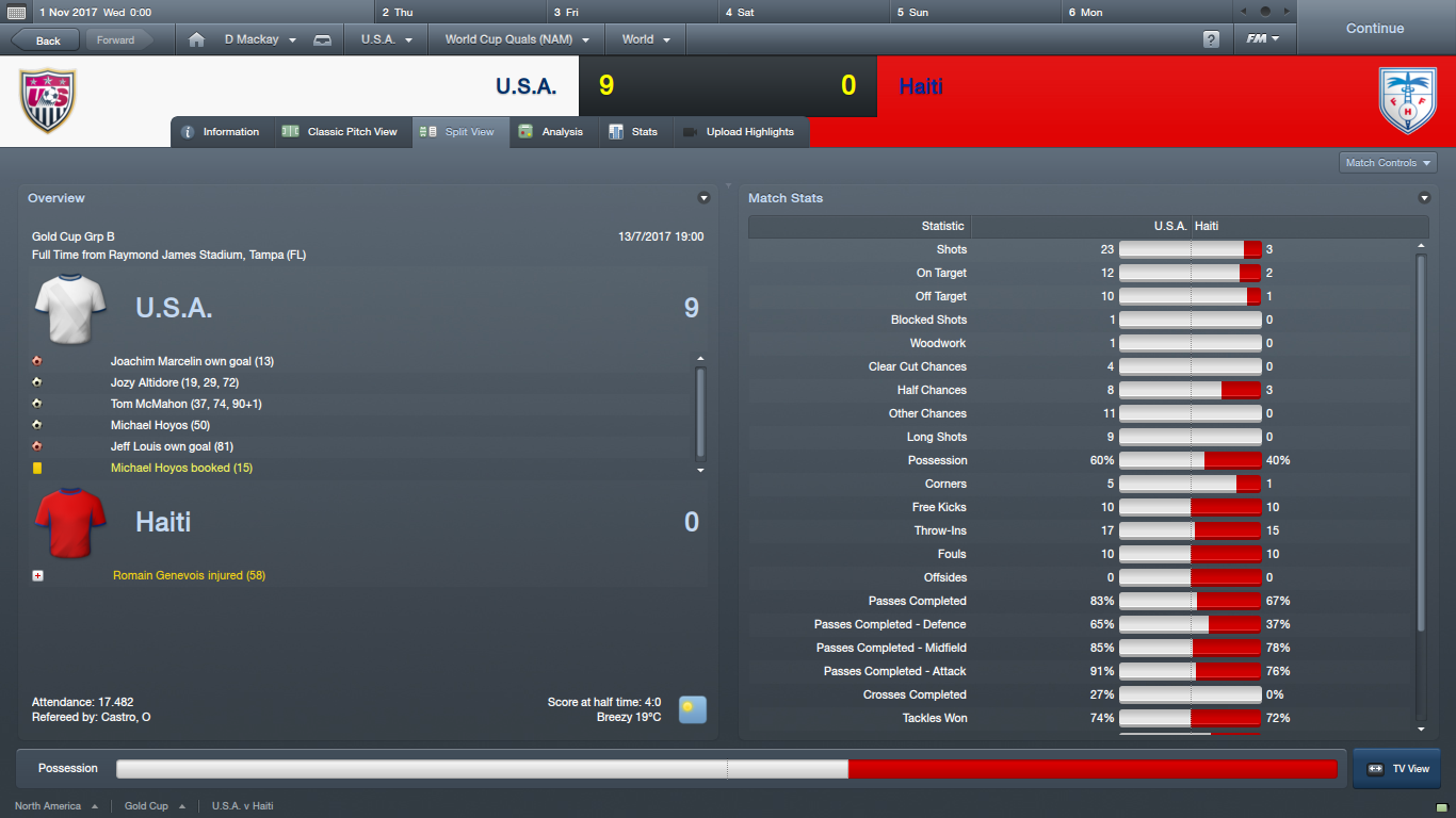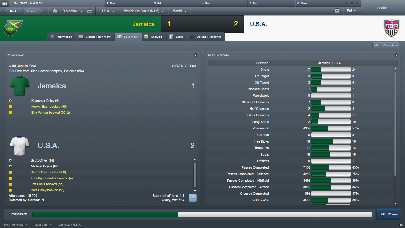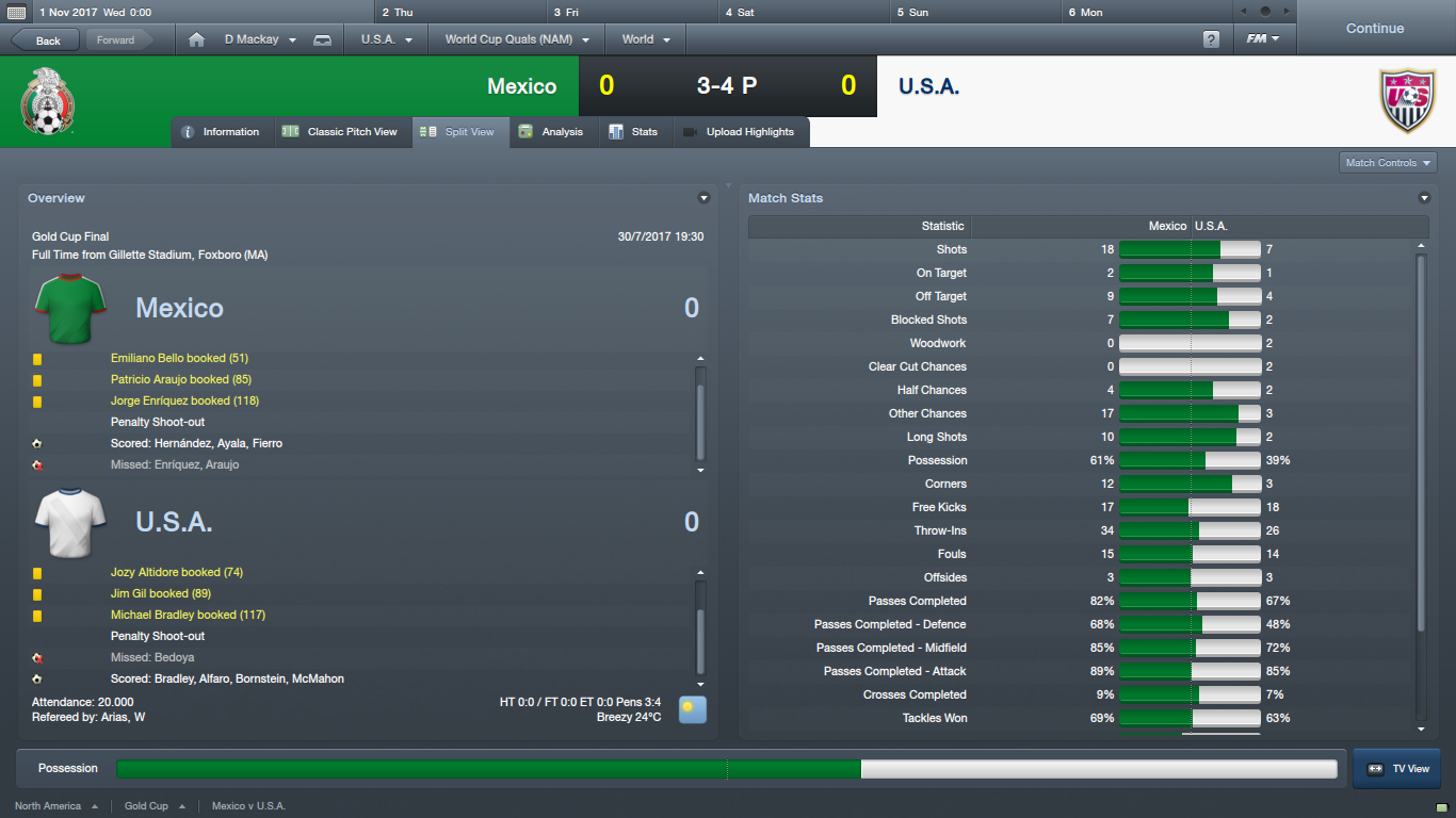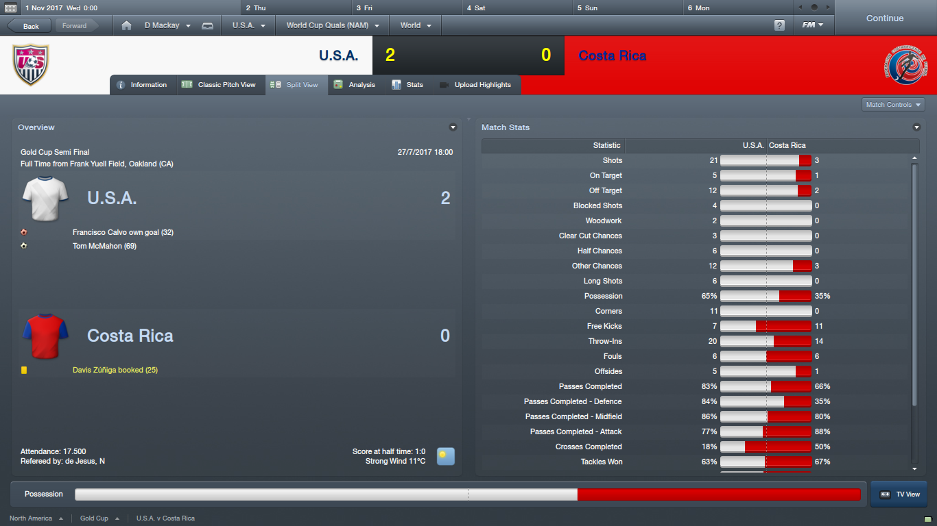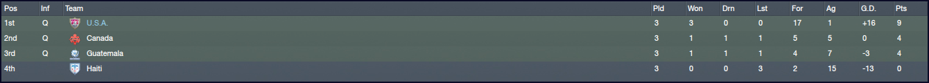 Na fase de grupos da Copa Ouro não tivemos muito trabalho, afinal, um grupo aonde o adversário mais amedontrador é o Canáda, é mole, tanto é que na estréia metemos 5 x 0 na Guatemala, vencemos sem dificuldade o Canáda e depois passamos em cima do Haiti, nunca comemorei tantos gols em minha carreira. Depois, veio o jogo mais complicado, a Jamaica não parecia um adversário assustador, mas tivemos muita dificuldades de passar pela seleção jamaicana, quase nos complicamos, mas nos minutos finais Hoyos nos classificou para a semi-final, onde passamos sem problemas por Costa Rica e na final, já íamos enfrentar o esperado, a seleção mexicana, o único adversário capaz de nos derrotar. Íamos enfrentando o México de maneira tranquila, sem tomar muitos sustos até que nosso lateral-direito resolveu dar uma voadora no adversário e ser expulso. Reconfigurei a equipe, que jogava num 4-4-2 britânico, com as mudanças, a equipe passou a ter um triângulo de base alta no meio, 1 volante e 2 centrais e um atacante lá na frente. Defensivamente fomos perfeitos, aguentamos 90 minutos perfeitamente, com alguns sustos é verdade, mas nada que nos custasse o título e mesmo jogando com um a menos, ainda acertamos a trave duas vezes, a sorte sobrou para defesa e faltou para o ataque. Sendo assim, fomos para a prorrogação e o panorama não mudou, a exceção que abdicamos totalmente do ataque, por causa do México, que vinha numa pressão avassaladora, mas mais uma vez o sistema defensivo prevaleceu e fomos para as cobranças dos pênaltis. Erramos o primeiro pênalti, mas depois disso, fomos perfeitos, e felizmente, o México converteu só 3 cobranças, fazendo assim a vitória da superação, da determinação tática e da raça estadosunidense. Foi um título suado, sofrido, mas merecido, não ficamos devendo nada ao México, que mesmo com a superioridade numérica, não conseguiu passar pela nossa defesa. No fim, fomos competentes e frios, para podermos comemorar o êxtase do hexacampeonato da Copa Ouro, o bi consecutivo, tornando assim, o Estados Unidos, ao lado do México, o maior campeão da competição.