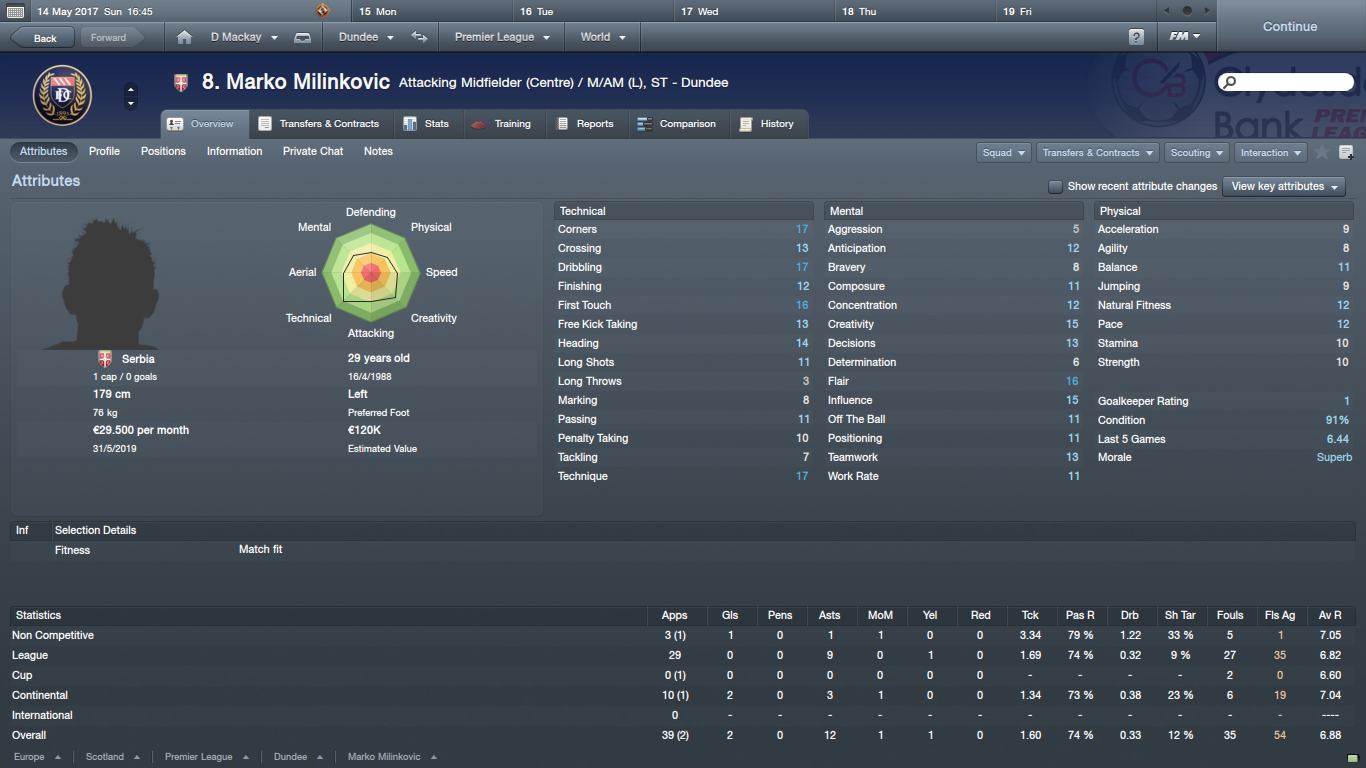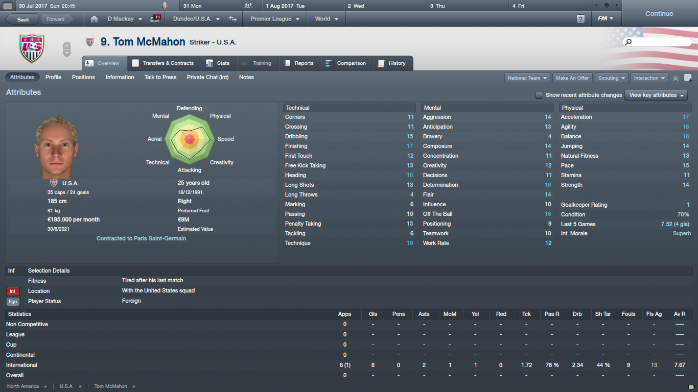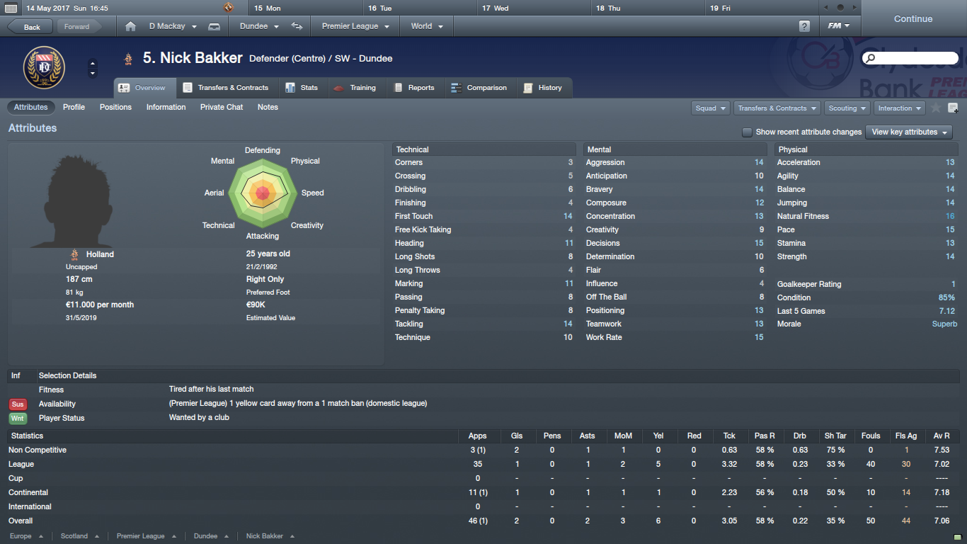 Por fim, decidi que era hora de sair do Dundee, depois duas rodadas na Premier League, vi que não estava mais motivado para continuar na equipe e que cometi a decisão errada de renovar o contrato por mais um ano, talvez a emoção do título com os Estados Unidos tenha feito com que eu quisesse mais daquilo e eu talvez tenha enxergado que o Dundee não é o melhor lugar para ser o melhor, portanto, senti que era hora de pegar o chapéu e esperar a tão esperada oportunidade na Old Firm surgir.