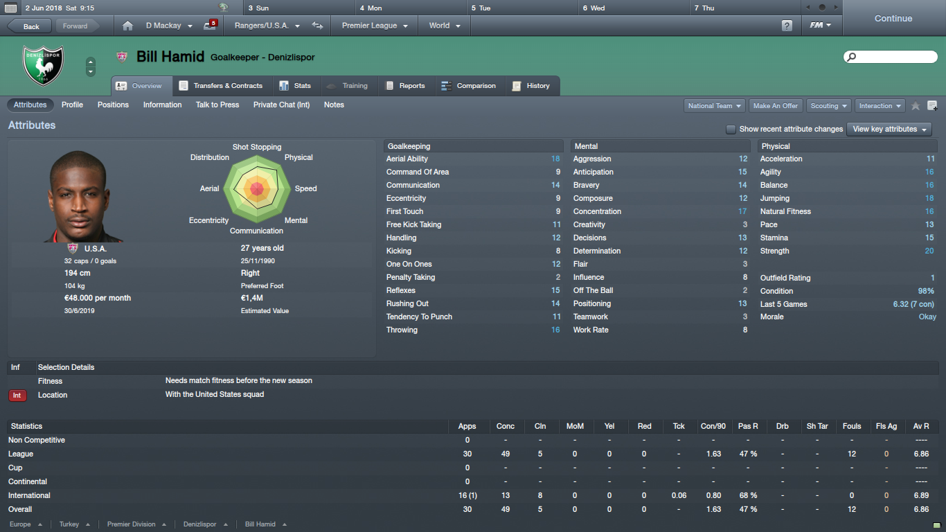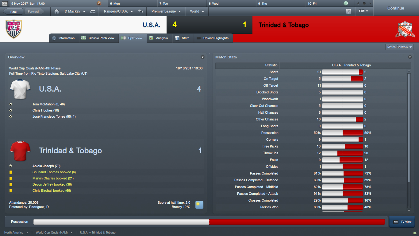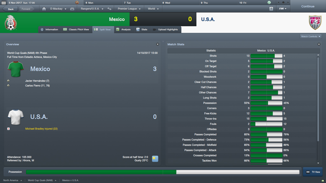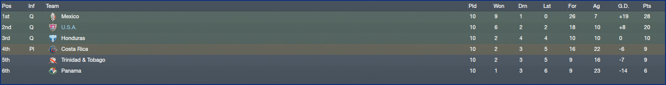 Terminamos o ano esportivo pela seleção de bem com a vida e com o passaporte para a Rússia em 2018 carimbado, acho que será uma ótima experiência para minha carreira. Como previsto, a grande pedra no sapata estadosunidenses seria o México e assim o foi. Faltando um turno para terminar a fase final da eliminatório da CONCAFAF não fizemos feio, ou algo perto disso, cumprimos nosso dever, podemos não ter sido uma ameaça para o México, mas que diferença fazia ficar em 1º ou 2º? Ambos estavam classificados e pronto. Podemos ter perdido pontos bobos como contra a Honduras, mas com 2 rodadas já estavámos classificados, foi bom para fazermos testes com a equipe e poder ter em mente os 23 que irão para a Rússia comigo. Inclusive já sabemos quem vai ser nosso adversário pela impossível luta a maior glória do futebol. O atual campeão e detentor de 6 títulos Brasil, a próxima sede da Copa do Mundo, Qatar e por fim, a Ucrânia, a equipe que temos que derrotar se quisermos chegar mais longe. Acho um bom grupo, dá para classificar, é só não temer os adversários.