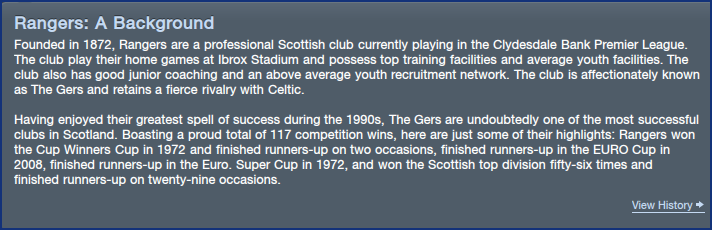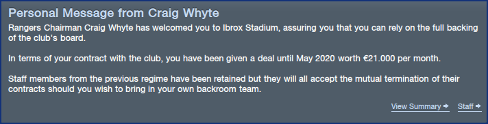 Além de carimbar meu passaporte para a Rússia, em meados de junho do ano que vem, ainda esse ano, carimbei meu passaporte de volta ao velho continente. A Federação Americana me ofereceu uma estadia nos EUA até eu arrumar um novo emprego, fiquei morando em Washington aos custos da própria e foi uma experiência agradavél, mas nada melhor do voltar para sua terra natal. Estou de volta a Escócia para realizar um grande sonho. Assumir um grande clube escocês. Desde que comecei essa carreira lá no Peterhead, antes de sair da Escócia, eu tinha em mente assumir ou Celtic ou Rangers, mas com o passar do tempo, minha sede pelo time de azul foi aumentando, principalmente por ver a crescente dominância dos Hoops e por outro fato, de nome Willie Maley, o treinador que fez o Celtic ser o que é. Ele ganhou 19 dos 45 títulos escoceses e ainda angariou 15 Copas nesse período. Ele foi o primeiro técnico dos Hoops e graças a eles, o clube tem a história que tem. E aposto que não ganhou um título europeu porque ainda não existia um. Portanto, ele é um gênio. Mas só que se eu assumisse o Celtic, eu iria ser comparado a ele e nunca chegaria ao status que quero chegar. Ser melhor do que ele e graças a isso, tenho que ser agradecido ao senhor Whyte, que me convidou para assumir o Rangers na tarde de ontem, prontamente aceitei, peguei um avião e agora estou aqui, como novo treinador de uma equipe irreconhecível. O Rangers hoje está em 11º lugar na Premier, posição inaceitável para o calibre do clube, minha missão vai ser difícil, pois minha análise inicial é clara, temos um bando de velhos decadentes no Rangers, enquanto uns são importantes como Sperdutti, a maioria não presta nem para a Premier mais. E outro desafio que encaro é a situação crítica do clube, com uma folha no seu limite e a ausência de dinheiro nos cofres do banco. Espero fazer o meu melhor de mim para esse time que tem grande história e com isso, catapultar minha história como um dos maiores treinadores que a Escócia já viu.