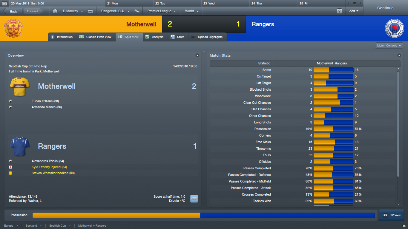 Não foi uma temporada feliz, portanto, não tenho muitas coisas a destacar, não gosto de ficar revendo derrotas. Mas dois momentos foram interessantes, a vitória no meu reencontro com o Dundee, lá em Dundee e o empate com o Celtic, mesmo tendo uma equipe muito inferior, o resto foi mais do mesmo na temporada do Gers.