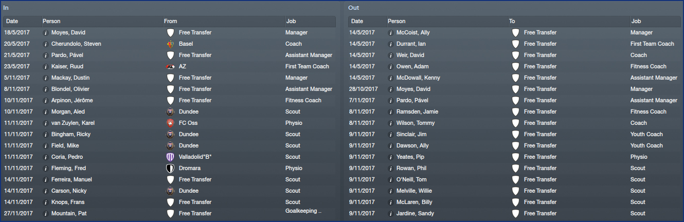 O começo do trabalho no Rangers foi de reformulação, primeiro mexi em toda a equipe técnica, mandando quem eu não achava apto para a rua e trazendo gente de confiança, alguns reforços do staff vieram do Dundee. Fico tranquilo depois de ter minha comissão técnica de qualidade montada, só adicionando peças aqui e ali. Em campo, tirei muita gente da equipe que o Moyes tinha montado, ficando com um elenco pequeno, portanto tive que me esforçar e procurar minuciosamente gente de graça, com salários de baixo para razoável e que não fizesse o Rangers passar mais vergonha do que já estava passando. Acho que trouxe alguns bons valores, mas não acreditava que tinha um elenco capaz de iniciar uma reação fulminante. Minha meta sempre foi arrumar a casa e eu ainda não consegui isso, mesmo com o final dessa temporada, temos muito a fazer, ainda e a próxima temporada não promete grandes mudanças.
