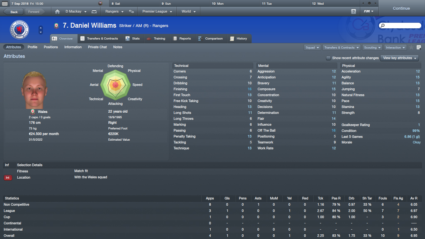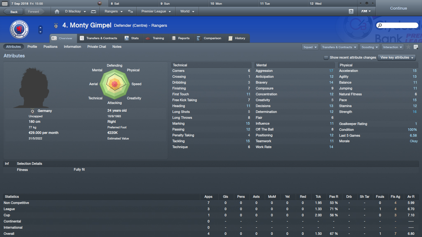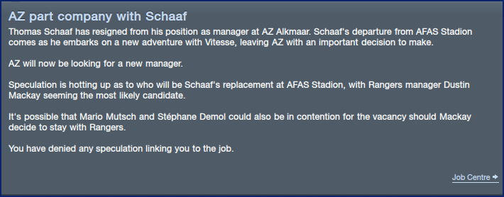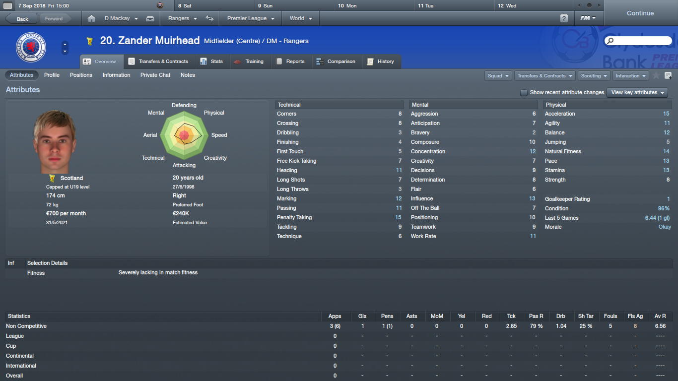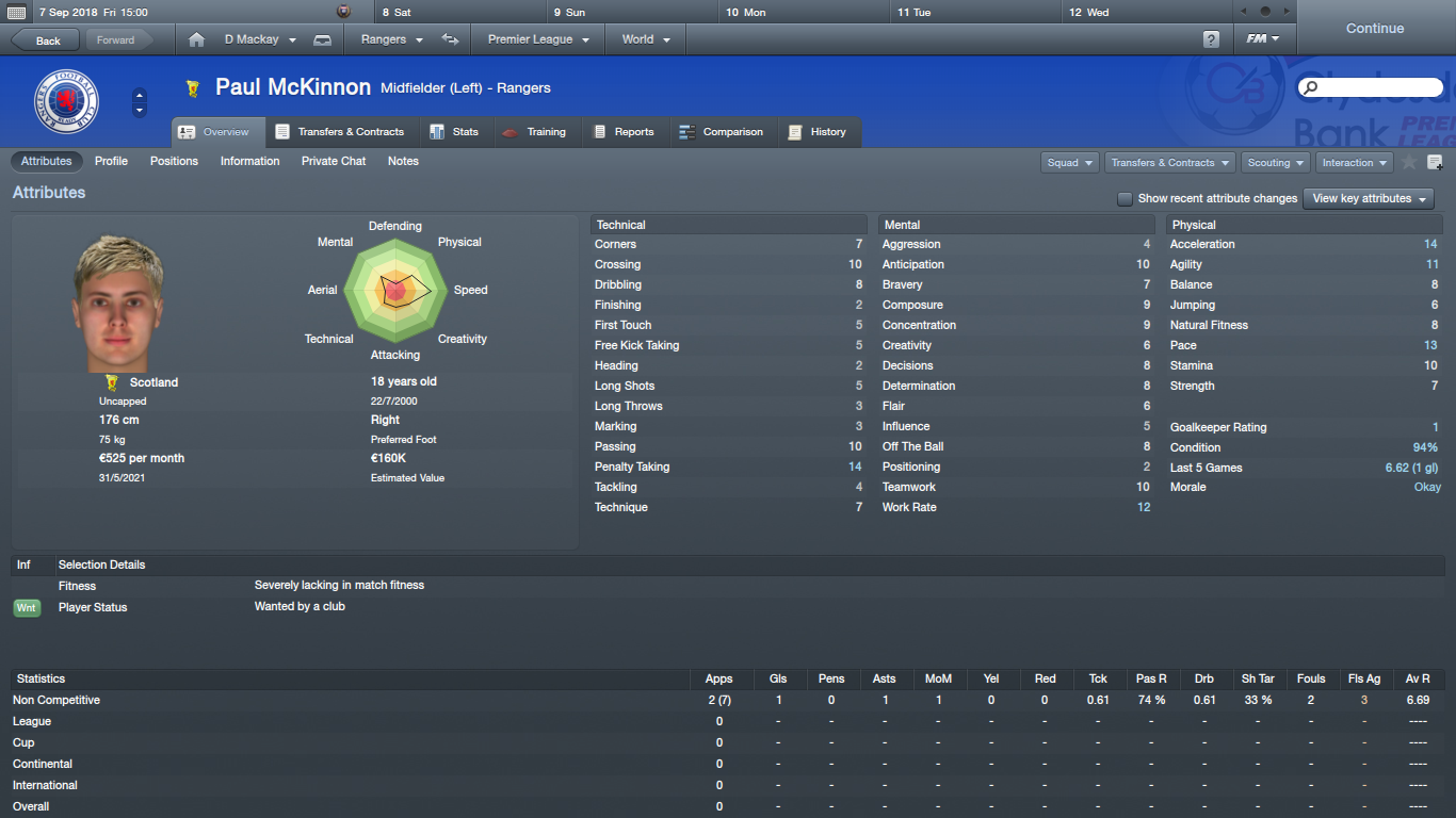 Como poderam notar, minha pré-temporada foi voltada ao lucro e não aos resultados ou ao preparamento correto da equipe, acho que tinhamos que fazer caixa, pois já tinhamos vendido as principais estrelas da equipe, dispensando ou emprestado os maiores salários e a situação financeira continuava ruim, então outras medidas tinham que ser tomadas. Ao final da pré-temporada, já tinhamos saido do vermelho, espero que isso seja o suficiente para manter o clube mais seguro financeiramente durante a temporada. Quanto a mim, especularam meu nome no AZ da Holanda, prontamente neguei qualquer especulação e será assim, até eu ser bicampeão da Champions League com o Rangers ou eles me demitirem, o que vier primeiro.