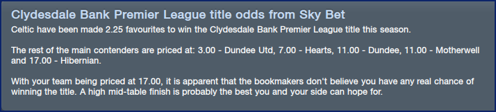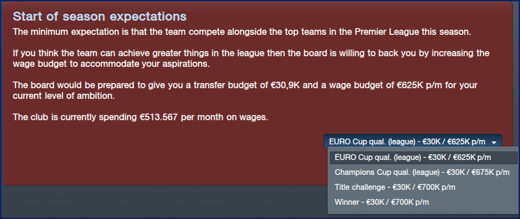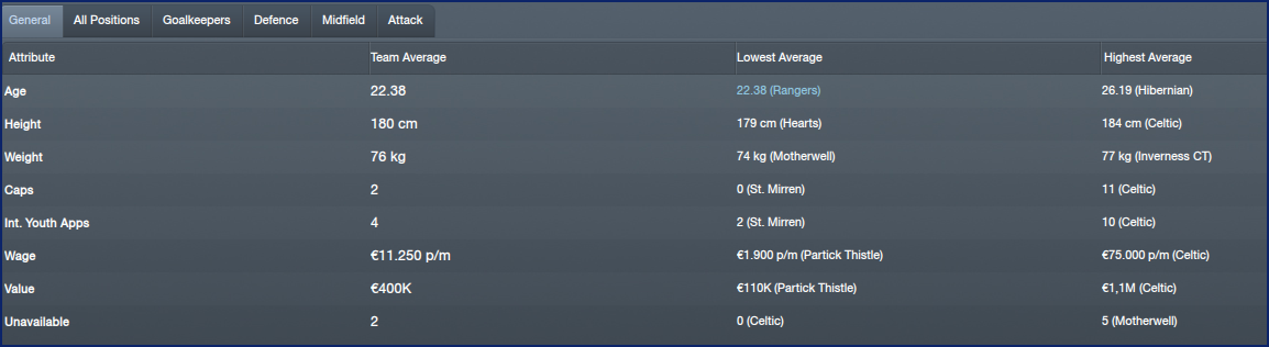 A aposta para essa temporada, quando ninguém dá uma uva pelo Rangers, foi simples, objetivei uma vaga na Liga Europa. O grande objetivo dessa temporada é recuperara o Rangers financeiramente, para que com o tempo possamos ter condições de competir firmemente pelo único título que o Celtic tem e que o lado de cá inveja, a Liga dos Campeões. E meu objetivo não é só vencê-la uma vez, quero vencê-la duas, para ultrapassar de vez e sedimentar a condição de maior clube da Escócia. No mercado, para a montagem de elenco, não fui ousado, pois o teto salarial não permitia, trouxe em sua maioria jovens jogadores com grande potencial e ainda fui buscar uma boa quantidade de jogadores advinda da base. Esse ano, o que vier é lucro.