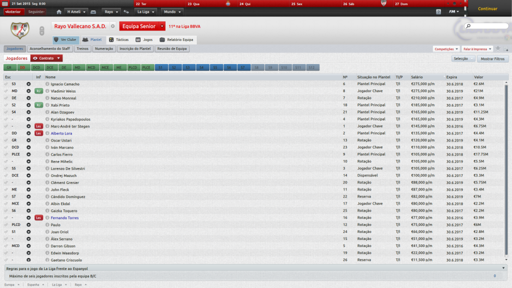 Jirimias Postado 24 de Dezembro 2011 Autor Denunciar Postado 24 de Dezembro 2011 Seria uma boa se ele topou ser reserva, mas clima ruim pode estragar todos os planos no Rayo. Quase disse sim, mas fiquei em cima do muro, desculpe por nao opinar. Sei que nao tem tempo de jogar, mas tem como printar o elenco, com a vista dos contratos, que mostra os salarios? Sem problema, meu caro!Tirei o print aqui, uma observação: os dois mais bem pagos,Camacho e Weiss, recebem €275m, e tem cláusula para igualar os salários com o mais bem pago, serão os dois que falei que vão rececer mais de €3000m, se o Villa vier. Traz e manda tutelar algum jovem seu, tipo o Paulo. Ia ser de grande ajuda. Dentro de campo, acho que seria bom, mas nada demais. Eh, tô meio em dúvida ainda, ele já vai ter 34 qdo chegar ao clube no final do ano, mas ainda está bem e pode ajudar os jovens. Contrataria, mesmo velho deve jogar muita bola ainda! Tb acho que ainda joga, só a idade que anda me deixando um pouco temeroso, mas é um ano de contrato, acho que dá para aproveitar algo de bom dele. ah se ja tem gente que mais esse nivel de salário, pode trazer. Paulo pegando umas dicas com ele vai mitar :) Eh, aind anão temos, mas teremos se ele chegar pela clásula de igualdade ao mais bem pago. Paulo ganharia muito com ele. Dependendo do esquema que você usa, eu aprovaria a contratação por ele jogar de MAEC também. Outro ponto importante é ele ser tutor para jovens, como o Ne0 citou ali. Mas ele tá velho demais pra mim. Vamos ver o que você decide. Isso que vc falou faz sentido, ele poderia ser um jogador para concorrência com o Mihelic ali na esquerda.Estou decidindo aqui, pensando os prós e contras. Citar