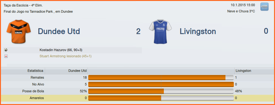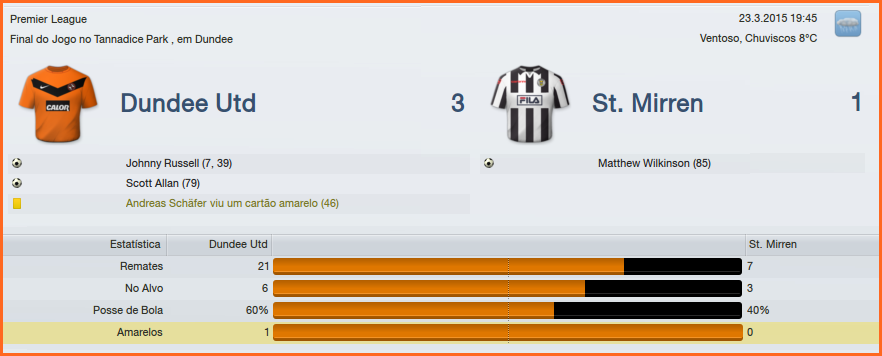Johann Duwe Postado 4 de Fevereiro 2012 Denunciar Postado 4 de Fevereiro 2012 Este bimestre foi praticamente todo dedicado para as competições caseiras, o único jogo continental foi a vitória contra o Rosenborg. Falando nisso tivemos o sorteio da 1º fase da Liga Europa e iremos jogar contra o fraco time do APOEL, do Chipre. Acredito que não terei dificuldades em vencer eles. Esta fase já reserva confrontos interessantes, como o duelo entre Dortmund e Juventus. Taça da Liga As semi finais foram jogadas contra o Rangers. A partida foi bastante fácil e uma das surpresas da temporada vem sendo as atuações de Vignaud, que está emprestado pelo Arsenal. Taça da Escócia Em um de total domínio do meu time, vencemos o Livingstone por 2x0, sendo os dois gols marcados pelo reserva Kostadin Hazurov. Clydesdale Bank Premier League Em Dezembro começamos enfrentando o time do Hibernian, aonde vencemos por 3x1, com gols de Russel e Vignaud. Logo em seguida enfrentamos o Celtic, onde de futebol pouco se viu, pois ambas as equipes pareciam estar muito nervosas e não se arriscavam ao ataque. O empate seria um resultado mais apropriado, mas acabamos por perder a partida por 1x0. Entre os jogos restantes podemos destacar algumas boas vitórias contra o St. Mirren, Kilmarnock e a goleada sobre o Hamilton por 4x0. Estamos indo bem na competição, mas estes recentes empates permitiram ao Rangers se aproximar do meu time.