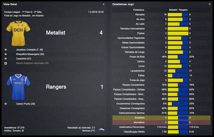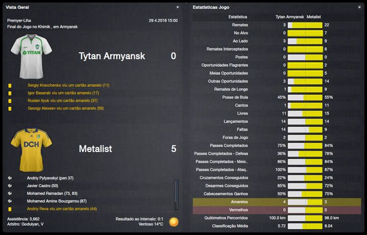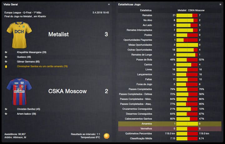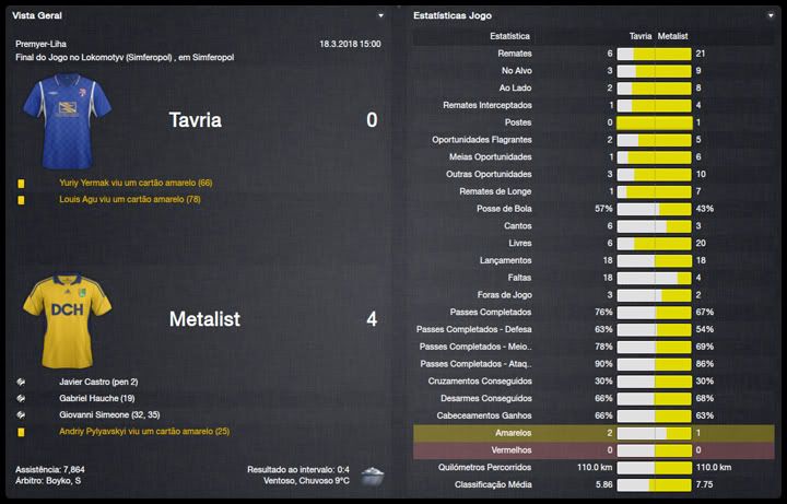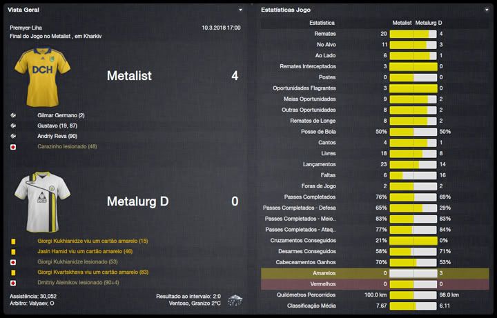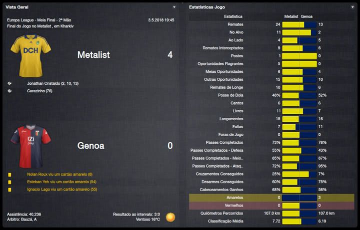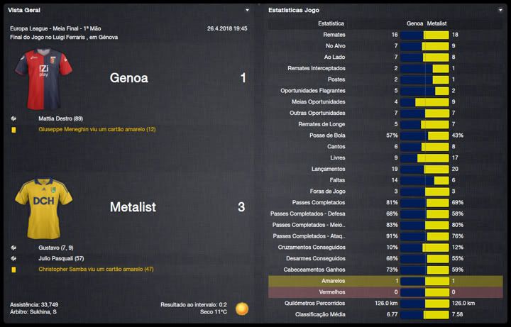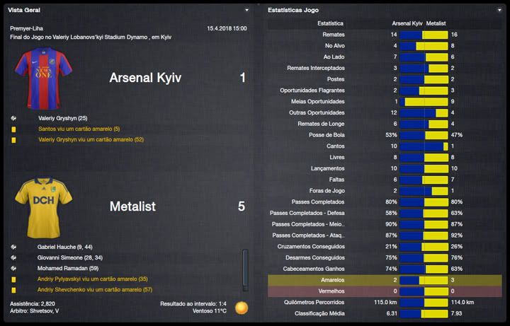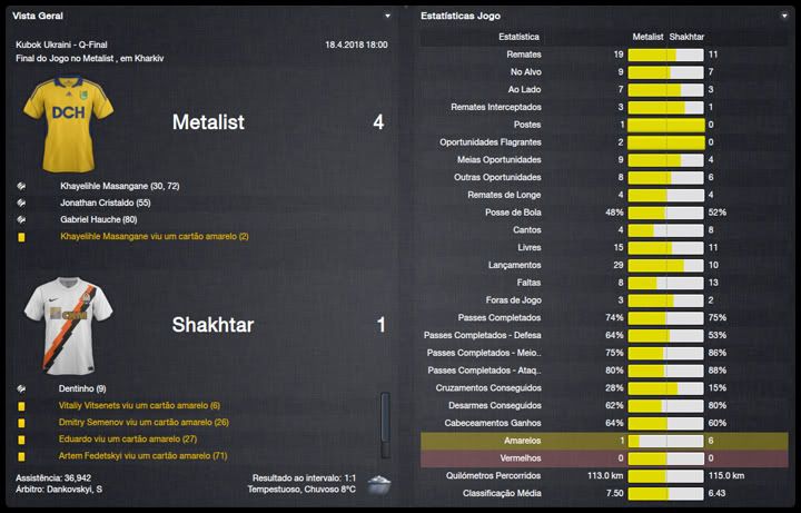 Bruno Trink Postado 19 de Março 2012 Denunciar Postado 19 de Março 2012 Lyon e Manchester United farão a final da Champions League 2017/18. Os franceses eliminaram a Inter de Milão na semifinal num confronto espetacular. A Inter venceu no Giuseppe Meazza por 2 a 1 mas o Lyon devolveu com um 5 a 3 no Stade des Lumières, com quatro gols de Alexandre Lacazette. Já o multi-campeão europeu United venceu o derby de Manchester mesmo perdendo por 2 a 1, já que havia feito 3 a 1 no Old Trafford. Assumi o comando do Metalist com um objetivo: dar ao clube seu primeiro título nacional. Claro que uma conquista de Europa League traz muito mais visibilidade, mas, com a história que tem, a torcida zhovto-syni merecia essa conquista. Confesso que esperava mais dificuldades. Exceção ao timaço do Shakhtar Donetsk com os brasileiros Douglas Costa, Lucas e Giuliano e os ucranianos Toporov, Chygrynskyi e Rakitskyi, os outros adversários, principalmente Dinamo Kiev e o rival Dnipro, me decepcionaram. A disputa, no final, ficou reduzida a nós e aos mineiros e, com excelente aproveitamento contra os pequenos, pudemos dar essa alegria à torcida. Ao mesmo tempo, muito por causa dessa facilidade no campeonato nacional, pude poupar titulares em algumas partidas para privilegiar o mata-mata da Europa League e, assim, supreender alguns e chegar até a final. PFC Olexandriya | Zirka Kirovograd | FC Obolon Kiev | CSKA Moscow | PFC Nyva Vinnytsya | CSKA Moscow Arsenal Kiev | Shakhtar Donetsk | Shakhtar Donetsk | Genoa | Tytan Armyansk | Genoa Depois de escoceses e portugueses, voltamos a enfrentar na Europa League uma escola mais parecida com a ucraniana. O CSKA era o líder do campeonato russo e certamente seria nosso adversário mais difícil até então. Fazendo a primeira partida em casa, sofrer poucos gols é sempre o mais indicado. Perder de pouco, dizem os analistas, mas meus times não "sabem" jogar assim. Fizemos 1 a 0 com Masangane mas Christián Benítez empatou. Na volta do intervalo, Gustavo nos colocou na frente de novo mas, mais uma vez, não sentamos na vantagem e acabamos sofrendo novo empate. Nos minutos finais, jogada pela direita do Gustavo, destaque da partida, e gol de Germano. Vencemos mas não tínhamos nada garantido. Muito pelo contrário, uma vitória simples dava a classificação aos russos. Por isso, e por nossas características, não jogamos fechados no CSKA-Peschanoye. Conseguimos manter o adversário longe da nossa área e eles tiveram que se virar com chutes de fora. Nosso bom jogo foi premiado com um gol contra, depois de linda jogada do Germano pela esquerda. Oliseh empatou no segundo tempo e, mesmo controlando os russos, os minutos finais foram de tensão, uma vez que um gol deles nos tirava da competição. Mas tudo correu bem e conseguimos a vaga para as semifinais. No outro lado, deu a lógica e o Genoa passou pelo Nacional da Madeira. No Luigi Ferraris, Gustavo confirmou para nossa torcida que eu acertei na sua contratação. Em dois minutos, aos sete e aos nove, marcou duas vezes e desmontou o esquema armado pelo treinador deles, Ezio Sella, curiosamente interino desde 2012. Podíamos até ter ampliado, o que só conseguimos fazer no segundo tempo, com um chutaço do Pasquali num rebote de escanteio. Il grifone, claro, pressionaram muito no segundo tempo, a trave nos salvou um par de vezes, mas Destro só conseguiu diminuir no final da partida. Na volta, foi a vez do Cristaldo desencantar. Nas últimas partidas, só tinha marcado uma vez, contra o Shakhtar, mas iniciou inspiradíssimo essa partida contra o Genoa, marcou três vezes em treze minutos e sepultou qualquer possibilidade de reação. Carazinho ainda completou a goleada que nos levou à decisão da Europa League. Na parte mais "difícil" do chaveamento, o Tottenham passou por Werder Bremen, Benfica e, finalmente, Napoli para chegar à final. Mesmo com a boa campanha na competição europeia, os Spurs não vão bem na Premier League e Mick McCarthy está ameaçado no cargo. Além disso, eles certamente não terão para a final a revelação peruana, o atacente Eddy Salas, e podem ainda não contar com suas duas lendas Gareth Bale e Tom Huddlestone. Mesmo assim, a camisa pesa e sei que não somos os favoritos para a decisão no Råsunda. Os quatro pontos que tínhamos de vantagem subiram para seis com um tropeço do Shakhtar antes do confronto direto e deixaram o nosso título ainda mais próximo. Ainda mais porque, mesmo com reservas, não deixamos o ritmo cair e continuamos vencendo todos que passavam pela nossa frente. Enfrentamos os mineiros na 27ª rodada mas, na mesma semana, tivemos o confronto pelas quartas de final da Kubok Ukraini. Não queria perder para não chegar com a moral baixa e resolvi arriscar e escalar uma maioria titular, limitado a regra de sete estrangeiros. Vencemos muito bem, por 4 a 1, de virada, aquela que para muitos era a final antecipada da Copa. Na Liga, deixamos clara a nossa superioridade e o crescimento do time durante a temporada. Se no turno fomos até dominados e a derrota foi inevitável, agora o time é amplamente superior e sobra dentro da Ucrânia. O título veio na rodada seguinte com o time reserva goleando em Armyansk. As duas últimas rodadas serão de preparativos para a fase final da Copa e para a decisão da Europa League. Agora quero a tripleta! Se a torcida tinha dúvidas sobre a contratação do Gustavo, se tínhamos gasto além do que deveríamos, o brasileiro mostrou que vale cada centavo e mais. Marcou contra o CSKA e foi decisivo contra o Genoa. Não desmerecendo o Hauche, que fez uma excelente primeira metade de temporada, mas o brasileiro está em outro patamar e, principalmente, é mais novo e pode render ainda mais nos próximos anos. O mesmo vale para o Germano, decisivo com suas assistências. Cristaldo continua como nosso artilheiro e com média de quase um gol por jogo. Apesar de estarmos com a cabeça ainda voltada para a final da Europa Lea