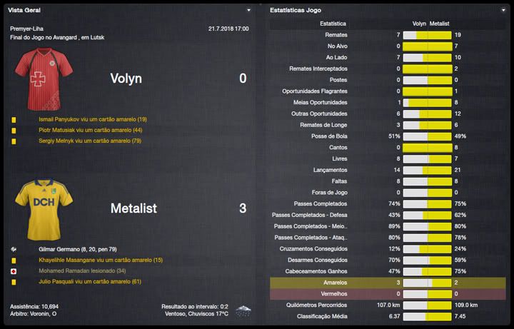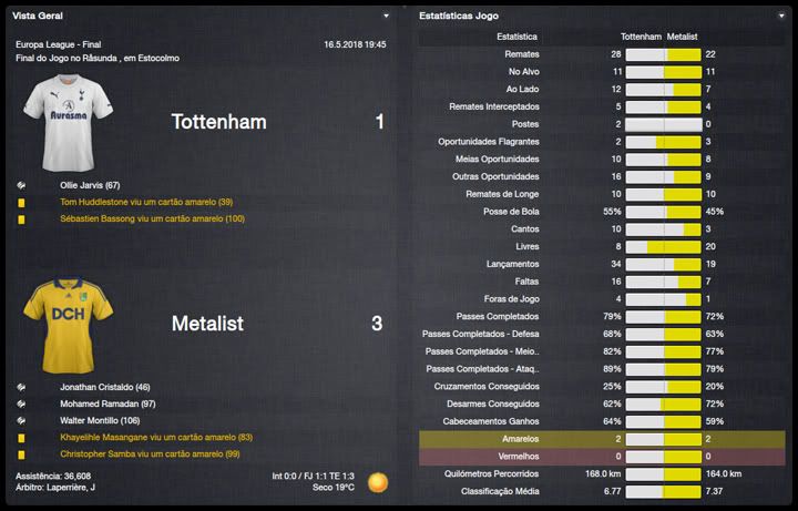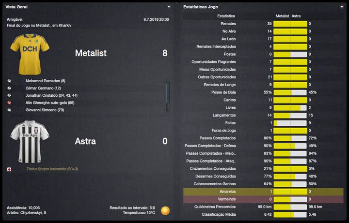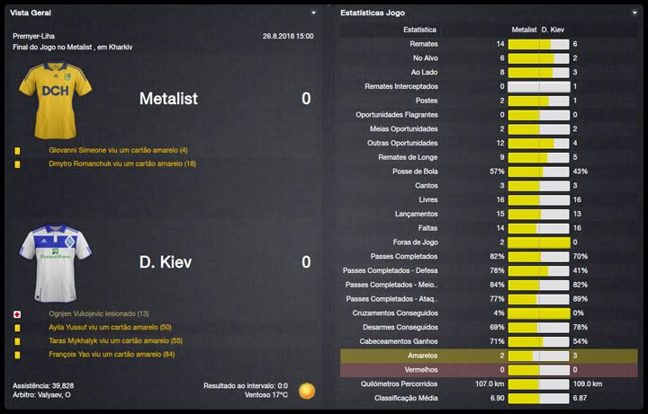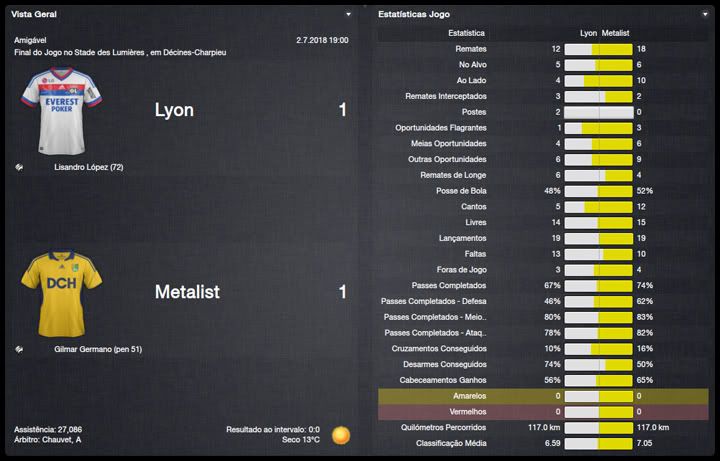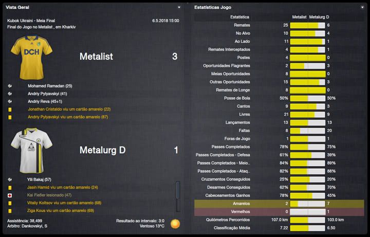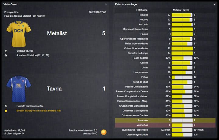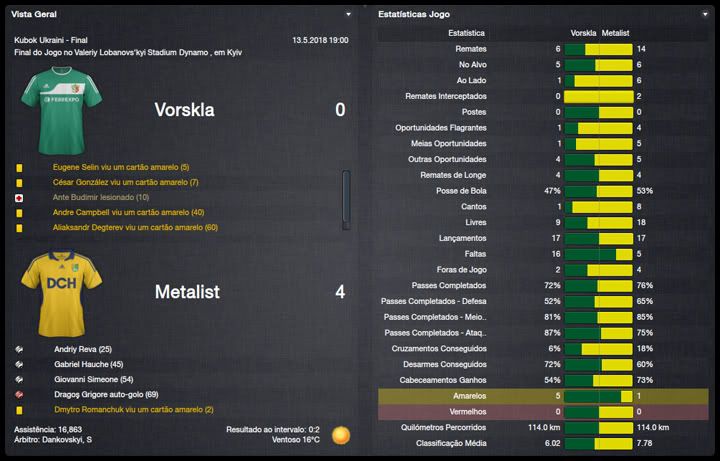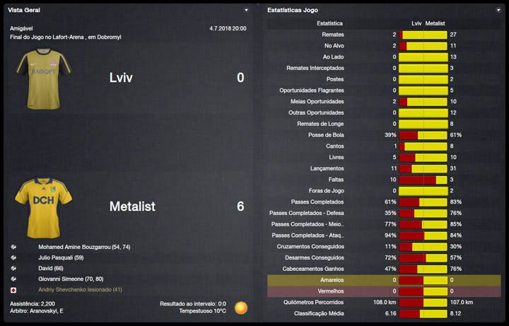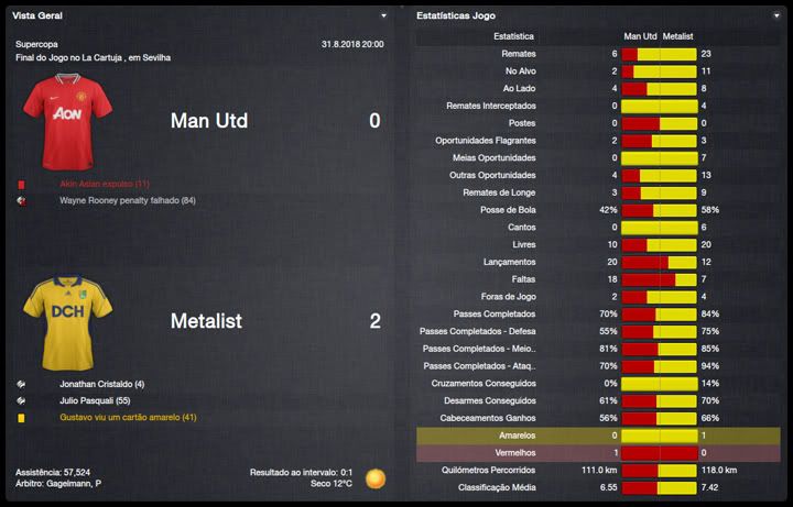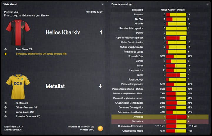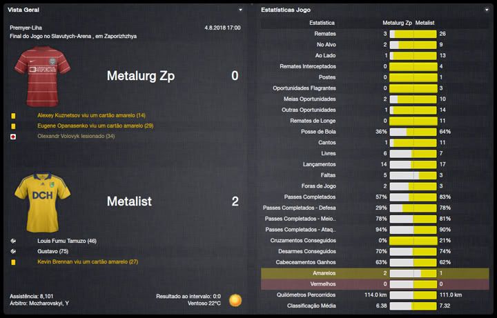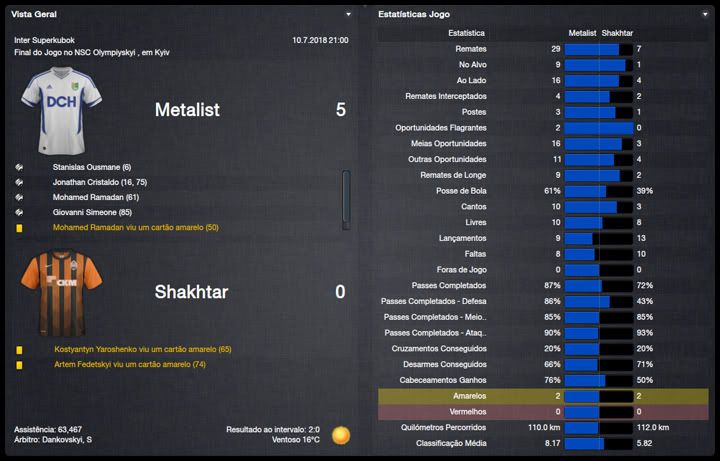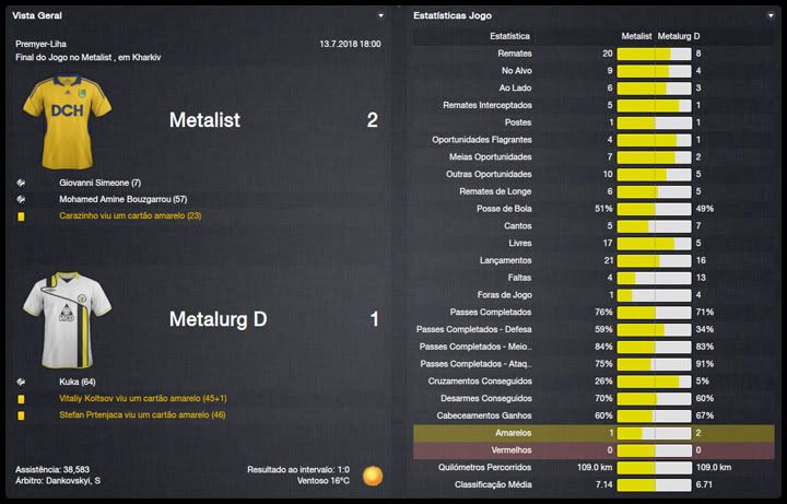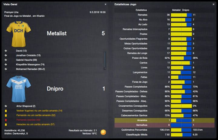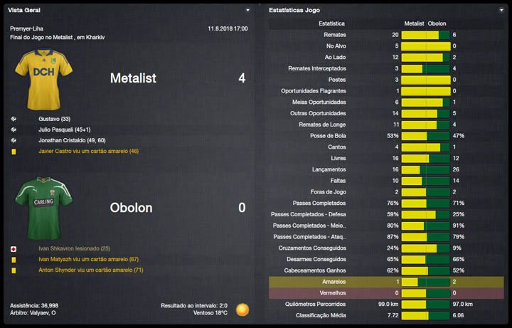 Bruno Trink Postado 26 de Março 2012 Denunciar Postado 26 de Março 2012 O English Team chegou perto do bicampeonato mundial mas foi derrotado na final da Copa do Mundo 2018 pela Argentina por 1 a 0. Poucas surpresas na competição, a não ser pelas eliminações de Brasil e Portugal ainda na fase de grupos. Esse início de temporada começou a mostrar que montamos um elenco capaz de brigar, novamente, por todos os títulos que disputaremos. Dois deles nós já ganhamos, a Inter Superkubok e Supercopa Europeia. Mais do que as duas conquistas, a forma como estamos sendo plenamente superiores na Liga e a maneira como encaramos o poderoso Manchester United me deixaram bem mais confiantes no que pode vir para o Metalist nesse que deve ser meu último ano. Das nove partidas, empatamos apenas uma, contra o Dinamo Kiev, quando jogamos com o time reserva pensando na Supercopa. A prova de fogo será essa complicadíssima fase de grupos da Champions League. Shakhtar Donetsk | Metalurg Donetsk | SC Volyn Lutsk | Tavria Simferopol | Metalurg Zaporizhzhya FC Obolon Kiev | Helios Kharkiv | Dinamo Kiev | Manchester United Sabia que, estando no terceiro pote do sorteio dos grupos da Champions League, a possibilidade de que caíssemos num grupo difícil era razoável. Quando vi Barcelona e Bayern no grupo C e Manchester United e Juventus no grupo H, pensei logo que estaríamos em um dos dois. Não deu outra. Com catalães e bávaros, completamos o grupo com o Anderlecht, já meu velho conhecido dos tempos de MTK. Difícil, sim. Impossível, nunca. Principalmente se aproveitarmos o fator casa, já que, depois da estreia na Bélgica, enfrentamos logo os dois no nosso estádio. Abrindo logo nove pontos, colocamos a pressão neles, ou em pelo menos num deles, e dificilmente deixamos escapar a vaga com mais uma vitória sobre o Anderlecht. Começamos a temporada mostrando logo nosso cartão de visitas: uma goleada sonora sobre o Shakhtar na decisão da Inter Superkubok, a supercopa ucraniana. Cinco a zero categórico em cima do maior oponente que tivemos na temporada passada. A Liga começou em seguida e, na 7ª rodada, ainda está meio estranha. Não pelo Dnipro dividindo a liderança conosco, mas temos o Sevastapol logo atrás e o Dinamo Kiev lá próximo da zona do rebaixamento. Claro, ainda falta muito. O Shakhtar, que não começou tão bem, já está reagindo. Não vejo o Dnipro e, principalmente, as duas surpresas mantendo o gás até o final. Nós vamos começar a precisar dar prioridade a UCL e escalar reservas na Liga. Mesmo assim, confio no elenco e podemos manter essa mesma pegada. Nem preciso falar nada depois desses resultados, não? Vocês já conhecem a força desse ataque e a única diferença é que, com Tran e Ousmane na zaga e Mamba na proteção, a defesa do Metalist agora também é muito forte. Sofremos apenas três gols nesses nove primeiros jogos e muito se deve a bola não chegar no gol do Neyzinho. No ataque, o Cristaldo continua absoluto com média de mais de um gol por partida. Fechamos o elenco com as saídas do Nkosi e do Bouzgarrou e as chegadas do atacante eslovaco Jakub Hutta e do lateral esquerdo Jeremie Kuhn, todos por empréstimo.