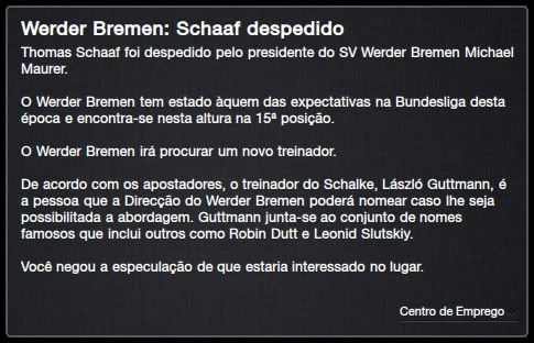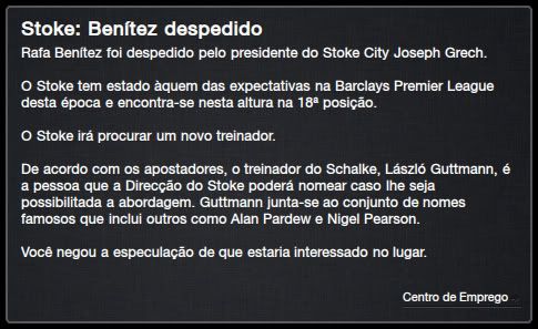 Bruno Trink Postado 14 de Abril 2012 Denunciar Postado 14 de Abril 2012 Novembro, todo mundo sabe, é mês de dança das cadeiras de treinadores. Três meses parece tempo suficiente para que os dirigentes avaliem o nosso trabalho e decidam por mudança de rumos. Aqui na Alemanha, os primeiros a mandar treinadores embora foram o Werder Bremen e o Dortmund. Não faz sentido alguma deixar o Schalke por outro clube alemão. No dia seguinte, Stoke City e meu nome voltava a ser falado na Inglaterra. Mas, também, só saio daqui para time top ou para um desafio fora da Europa. Uma semana depois, Roberto Mancini foi convencido a deixar o Liverpool para treinar os potters. Não sei qual foi, mas com certeza ele teve seus motivos para isso, apesar da campanha apenas razoável que os reds fazem na Premier League. Quando meu nome foi especulado por lá, eu não pude esconder meu interesse. A diretoria do Schalke não gostou muito, mas não podia mentir e me mostrar aberto a um possível convite. E esse convite veio hoje, cinco dias depois. Difícil não aceitar. Hamburger SV | FC Energie Cottbus | Borussia Dortmund | Debreceni VSC | Bayer 04 Leverkusen Se sair mesmo, deixo o time classificado para a próxima fase da Europa League e bem perto da liderança da Bundesliga. Estamos, junto com o Stuttgart, um ponto atrás do Wolfsburg, muito graças ao nosso ataque de média de mais de três gols por partida. Werder Bremen e Dortmund mudaram de treinador para tentar sair da zona de rebaixamento enquanto o Bochum parece com o passaporte carimbado para voltar a segunda divisão. Mal me apresentei aqui nesse cantinho e não sei se já me despeço. Conversei rapidamente com o professor depois do jogo em Leverkusen e ele me contou sobre a proposta do Liverpool. Ele me pareceu muito tentado a aceitar, não só pelo salto na carreira e pelo desafio, como também pela questão salarial, já que, pra começo de conversa, lhe foi oferecido quase 50% a mais do que ele recebe aqui. Eu mesmo não sei se sairei junto, já que ele que me trouxe para o Schalke. De qualquer forma, dentro de campo, a dupla de ataque formada pelo turco Güngör e o grego Laiveras tem se entendido brilhantemente, apesar da rivalidade histórica entre seus países. A respeito das possíveis saídas do Matip e do Rensing, nada ficou definido e eles seguem no clube. Como estamos em data FIFA de amistosos de seleções, só voltamos a jogar daqui a duas semanas, aqui na VELTINS-Arena, contra o ameaçado Werder Bremen.
