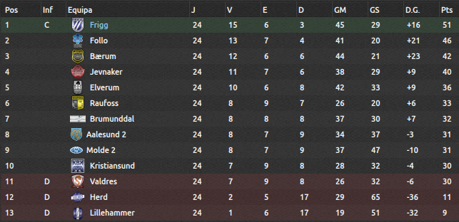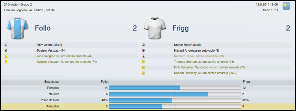 Johann Duwe Postado 26 de Março 2012 Autor Denunciar Postado 26 de Março 2012 Após um início complicado, parece que as coisas finalmente se ajeitaram aqui em Oslo. Depois da mudança tática das ultimas rodadas, o time melhorou bastante e ficou invicto nestes três meses. O mês de Junho seria bem curto, apenas 2 jogos em 30 dias. O primeiro deles foi contra o Raufoss, onde jogamos muitíssimo bem e vencemos por 2x1. No ultimo jogo do Mês fomos enfrentar o Elverum e saímos de lá com nova vitória por 2x1. Logo no começo de Julho recebemos um dos candidatos ao rebaixamento, o Lillehammer. Numa partida onde fomos claramente superiores vencemos novamente desta vez por 3x1. O jogo contra o Valdres foi mais equilibrado, e aqui foi despertado o instinto de matador de Kenneth Tonne que marcou todos os nossos gols na partida. Após estes excelentes resultados, contra o Aalesund II saímos vencendo mas permitimos o empate em duas oportunidades, o que é uma grande infelicidade. Mas na rodada seguinte contra o Brumunddal vencemos novamente. A partida contra o Follo seria uma partida de 6 pontos, pois naquela ocasião ambos estavam com a mesma pontuação. Contra eles começamos muito bem, abrimos 2x0 com facilidade logo aos 10 minutos de jogo e daí em diante tentamos a todo custo segurar este bom resultado, mas não foi possível e o empate foi o placar final. Segue uma vitória simples contra o Kristiansund e mais uma partida de 6 pontos, desta vez contra o Baerum. Contando com vários desfalques - meu banco tinha 4 jogadores - aconteceu o que era esperado, um jogo de ataque x defesa durante todos os 90 minutos. Nas poucas chances que tive, felizmente em uma delas foi bem aproveitada por Eirik Nordseth que garantiu a vitória por 1x0. Da para dizer que a luta pelo título ainda está entre Frigg Oslo, Follo, Baerum e Elverum, mas faltando apenas 7 rodadas para o fim é provável que tropeços aconteçam e se eu não tropeçar vou poder ampliar a vantagem. Na parte contrária da tabela, Herd e Lillehammer irão tratar cada partida como uma batalha de agora em diante. Citar