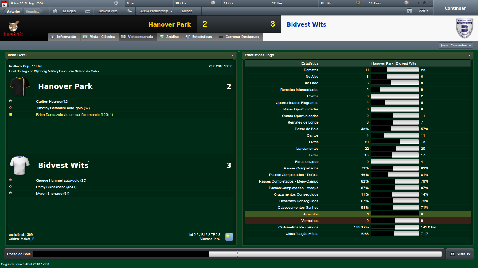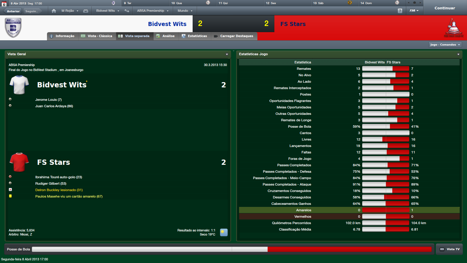 O Bidvest soube ser frio. Segurou o adversário teoricamente mais forte, fez o gol e se fechou, mas não se acovardou. Em suma, foi isso o que aconteceu no Orlando Stadium, onde o Pirates e o BidVest Wits jogavam pela liderança. A vantagem de jogar em casa se transformava aos poucos em pressão contra o Orlando. À medida que os visitantes tinham maior posse de bola, os torcedores do Pirates perdiam a paciência, o mesmo ocorria com os jogadores do time da casa."Sabemos como ninguém que o apoio que vem da torcida faz toda a diferença dentro de uma partida, porém o contrário também é verdade.Soubemos jogar com a cabeça, principalmente quando fizemos o primeiro gol" - afirmou Marcus Rojão.
