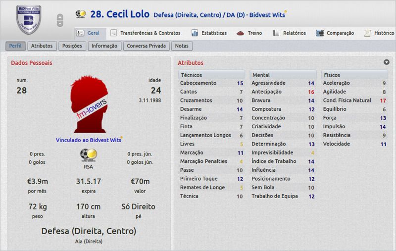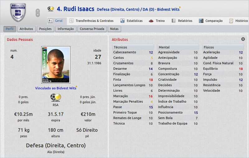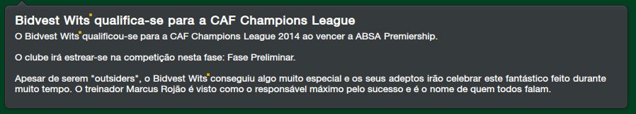 image2.png Uma semana depois de anunciar dispensas e negociações envolvendo os atletas que não fazem parte dos planos do treinador Marcus Rojão, o BidVest apresentou o pacote de reforços para a nova temporada. Certamente, a torcida esperava por nomes famosos, principalmente pelo fato do clube participar nesta temporada na Liga dos Campeões, porém receberam com alguma decepção o anúncio de nomes bem menos conhecidos. Enquanto não caem na graça dos torcedores, os novos reforços pelo menos já conquistaram a confiança do técnico, que lembrou da experiência da maioria dos reforços como fator decisivo para a formação desta equipe.
