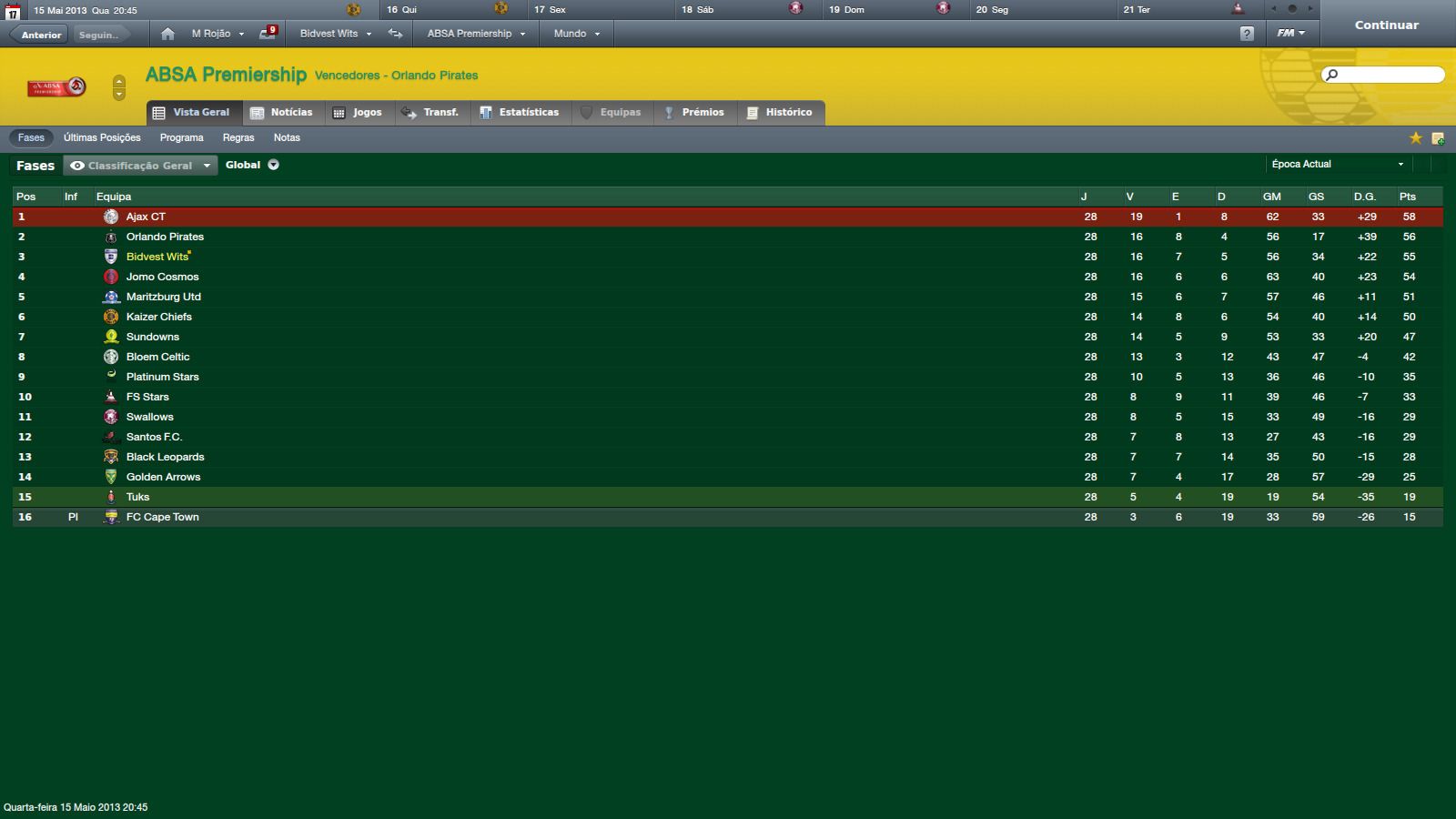 Sob a proteção de Pai Regilson, o Bidvest via o título da Premiership escapar pelos dedos depois de passar mal bocados nas últimas rodadas. Coincidentemente, os Wits apresentavam a mesma queda de rendimento do Mitra Kukar, e curiosamente os dois times viraram o ano na liderança. Tanta coincidência incomodava Rojão, que cada vez mais tinha a certeza de que um time campeão é formado por mais de onze jogadores. A falta de reservas que substituíssem à altura os titulares pressionava o treinador a escalar os mesmos jogadores em vários jogos seguidos, vários jogos seguidos no final da temporada significam desgaste físico.
