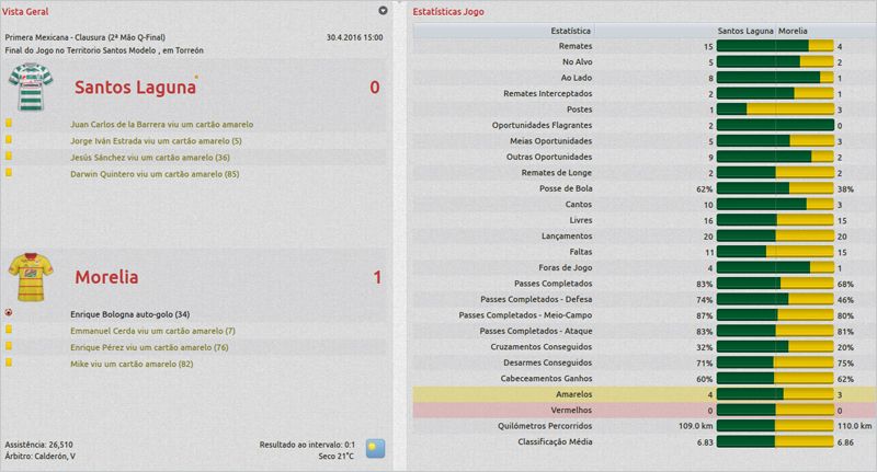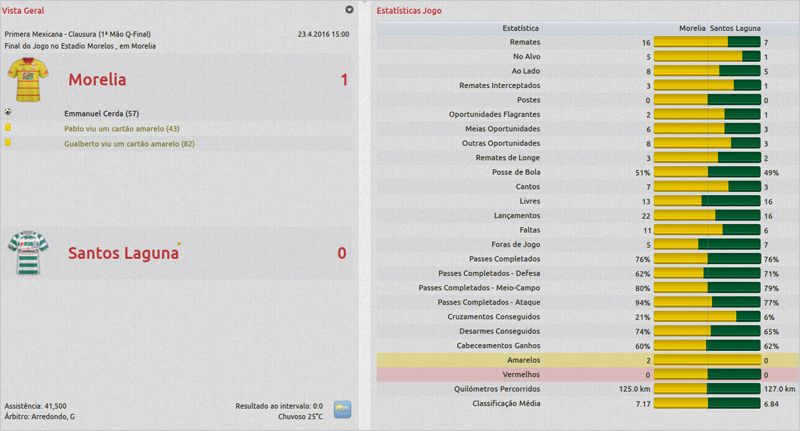 O esboço de reação do Santos Laguna ficou mesmo no primeiro confronto contra a Católica, pois no jogo seguinte o time deixou a desejar. Jogando fora de casa caímos perante o Morelia: 1-0 Apesar da derrota na primeira partida das Quartas de Final, o Santos precisaria apenas de uma vitória por dois gols, algo possível se a equipe jogasse pelo menos metade daquilo que é capaz. A minha preocupação era só a forma como a equipe perdeu, sendo dominada e por pouco não viu uma vantagem maior para ser superada.