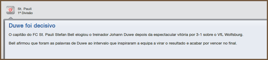 E não é que a bronca surtiu efeito imediato, pois Senghor empatou aos 48' e dai em diante as ações mais perigosas foram do St. Pauli que alcançou a virada com gols de Costa e Sorensen, o placar no apito final foi St. Pauli 3x1 Wolfsburg. No dia após a partida, o capitão Stefan Bell reconheceu a importância do puxão de orelha no intervalo.