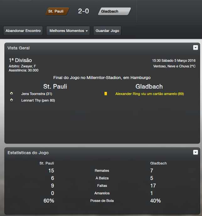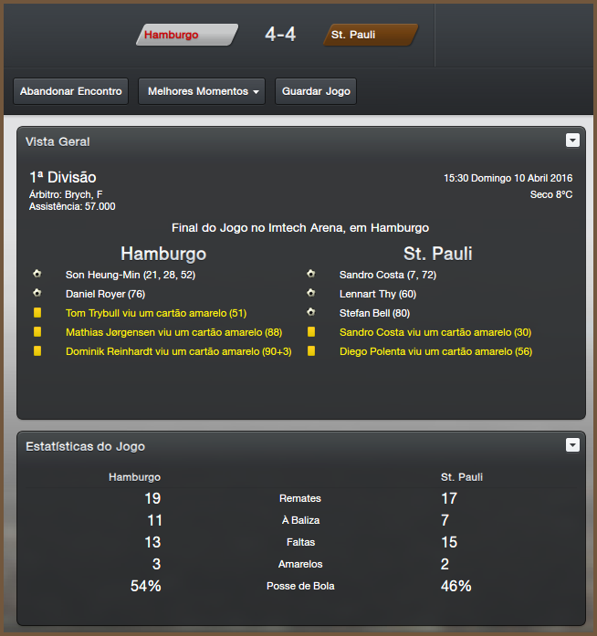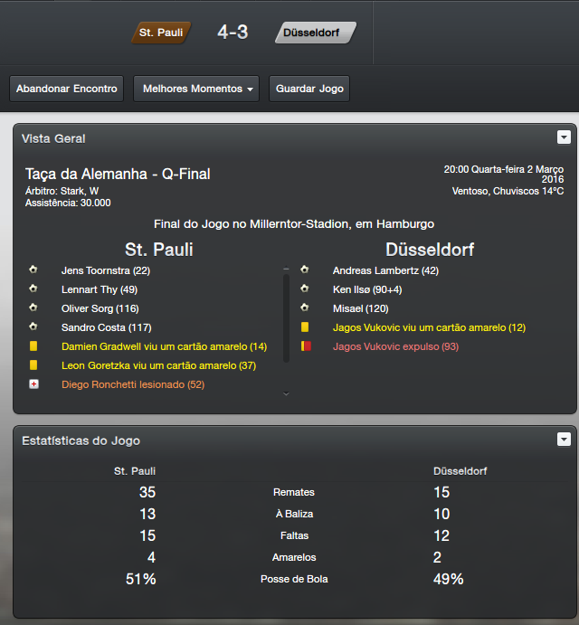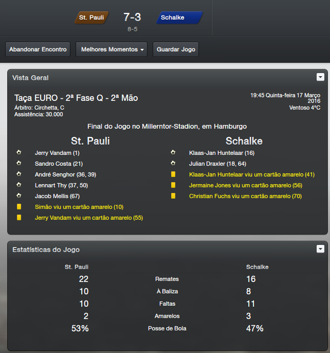 Logo após a eliminação, outra partida complicada contra o nosso maior rival. No Derby Hamburguer, a partida foi muito boa para as duas equipes e também para a torcida presente, afinal não é todo dia que se uma partida de 08 gols. Contra o Hamburg foi a ultima vez que fui com força máxima na Bundesliga, após isso deixei algumas posições com jovens e reservas. Mas mesmo assim a derrota não veio na Bundesliga, contra o rebaixado Dynamo Dresden, contra o Nürnberg, contra o Wolfsburg, Friburgo e até contra o Bayern München abdiquei dos titulares. Na ultima rodada contra os Baváros, sai perdendo logo cedo mas tratei de empatar pouco depois, após isso sofri outro gol e busquei a virada. Acredito que nem mesmo o time local veio com titulares, mas enfim foi uma bela vitória por 4x1.