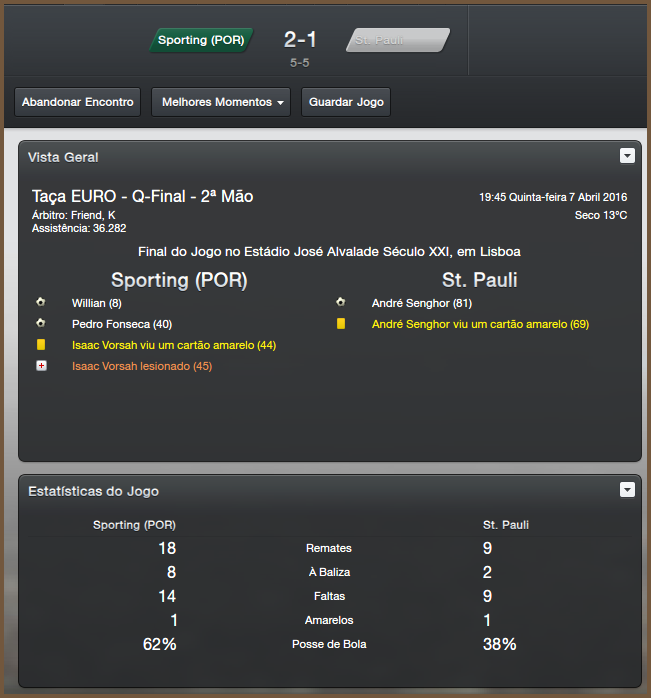 Antes da decisiva partida contra o Sporting, tínhamos um confronto pela Bundesliga, contra o Köln, cujo qual vencemos facilmente por 2x0. A hora da verdade se aproximava, estávamos com vantagem pela vitória na primeira partida, porém infelizmente não conseguimos realizar uma boa partida, o time local abriu 2x0 com facilidade e apenas no final da partida é que descontamos e o placar ficou com a vitória por 2x1 para o Sporting. Fiquei um pouco triste por sermos eliminados, mas não jogamos uma boa partida e o Sporting só parou na final mesmo, se tornando o vice campeão.