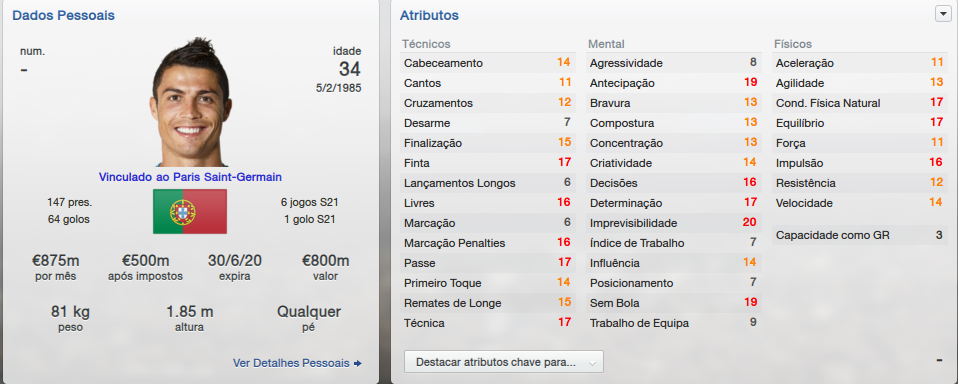 Cristiano Ronaldo apesar de não estar no auge pode ser útil, na primeira vez que vi os seus atributos, sua idade e seu salário achei que tinha sido uma contratação desnecessária, mas como não há tantas opções para a reserva pode ser bastante útil.