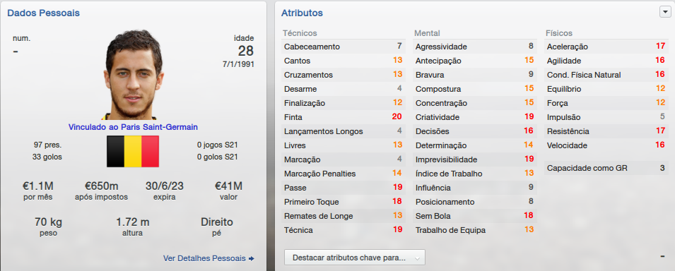 Com um time rico assim eu ainda não tinha jogado nesse save. Até tinha comentado que não ia abusar em contratações no último post, mas foi maior que eu. Poder comandar grandes jogadores do futebol mundial é muito bom. Não trabalhei tanto no mercado de transferências, foi mais difícil vender do que contratar. A parte complicada de comprar era escolher o jogador ideal. No fim chegaram três grandes jogadores para compor o ataque do PSG: Eden Hazard (listado para transferência no Chelsea), CR7 e um newgen monstruoso, o inglês Sommerville.