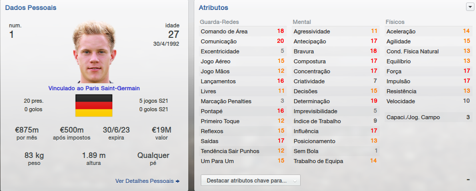 Titular: Stegen é o melhor goleiro que tenho à disposição. Seria um dos melhores do mundo no save se tivesse melhores atributos em Jogo de Mãos. Confio bastante nele.