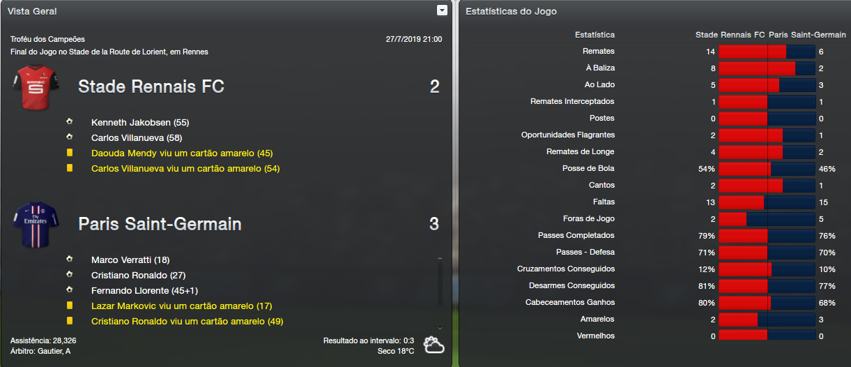 No último campeonato francês o PSG terminou na 7ª colocação, pior participação até agora desde que comecei esse jogo. Porém nem tudo foi ruim na temporada que passou para os vermelhos e azuis. Eles conquistaram em 2019 a UEFA Europa League mais a Taça da França, a taça mais importante do país depois da Ligue 1.