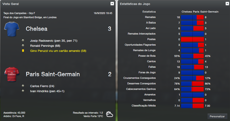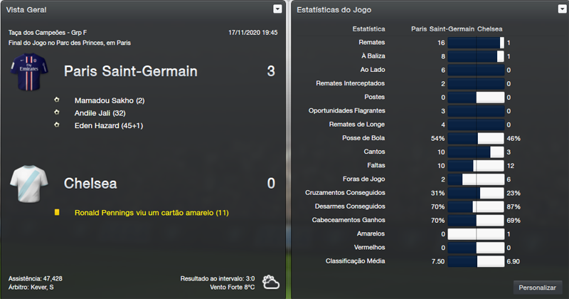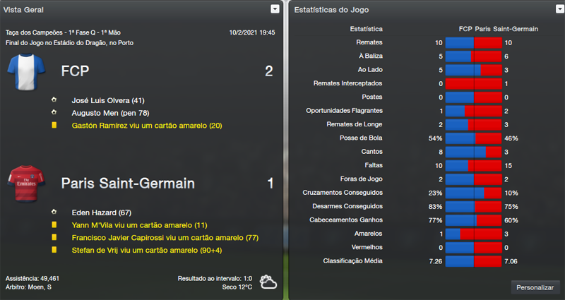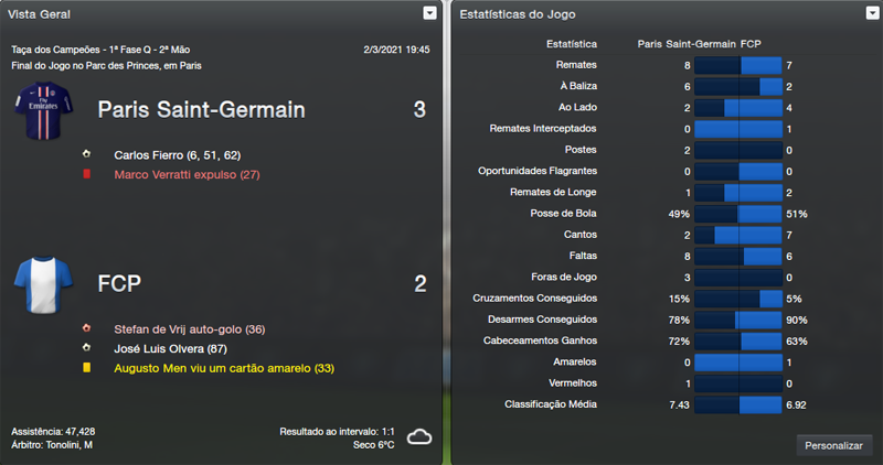 Fierro mais uma vez fez não só um, mas dois gols, deixando o PSG num a um passo da vaga nas quartas. Me segurando como podia já que agora o Porto precisava do gol e estava com um jogador a mais eu esperava o tempo passar desesperadamente. E foi aos 87 que ele parou. O mítico atacante estado-unidense dos visitantes fez, de rebote, o gol que selou a passagem dos portugueses para a fase seguinte, no único descuido da minha zaga no segundo tempo.
