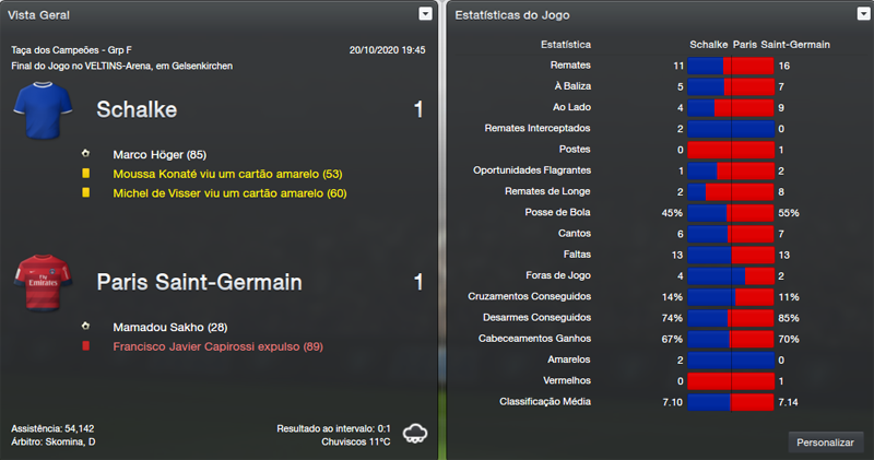 Jogo dominado pelo PSG. Tivemos o controle da partida do início ao fim e contamos com a boa pontaria do costa-marfinense Doumbia e do prata-da-casa Roche. No segundo tempo o Schalke melhorou porque sentiu o baque e precisava do empate mais do que nunca e conseguiu descontar. Mas não passou disso. Ganhamos moral com o resultado.