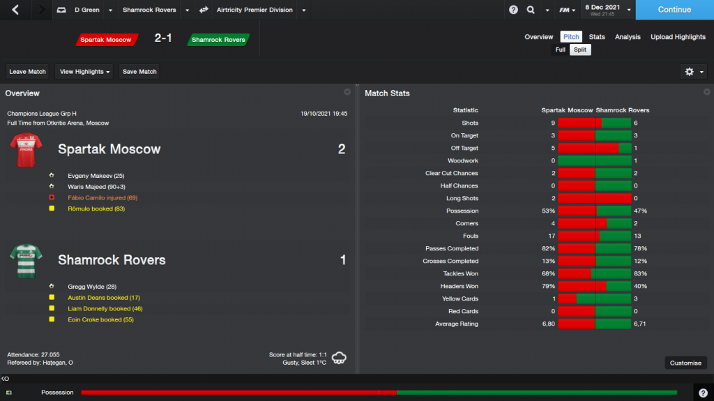 A única lamentação que tenho desse campeonato foi a derrota para o Cork City, esse pequeno deslize na 6ª rodada impediu um épico título invicto, já que nos outros 27 jogos após a nossa única derrota, só deu Shamrock Rovers. Uma demonstração absoluta do tanto que a Irlanda se torna minúscula para nós, uma pena que o torneio só dá uma vaga na Champions League, impedindo assim que outras equipes possam tentar evoluir e diminuir o abismo que vai se tornando a Premier League. Só para constar, fomos campeões com 6 rodadas de antecedência. Marca nunca atingida na competição desde que assumi o posto de técnico.