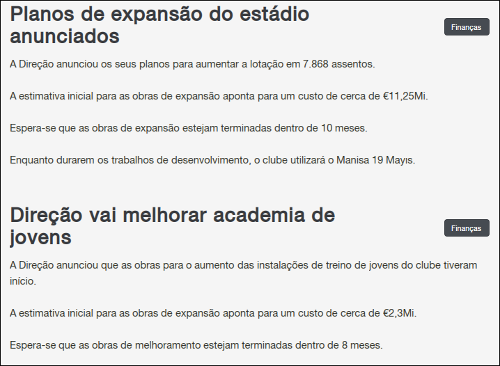 Eu tenho tentado não usar os clubes apenas com trampolim para a carreira do Kemel, por isso tenho tirado dinheiro que poderia ser utilizado em contratações em troca de evoluir a estrutura dos clubes, como consegui fazer com o Karabukspor (2 melhorias) e agora com o Goztepe. Isso pode até retardar a conquista de títulos, mas pelo menos deixarei o clube em melhor situação quando o Kemel sair.