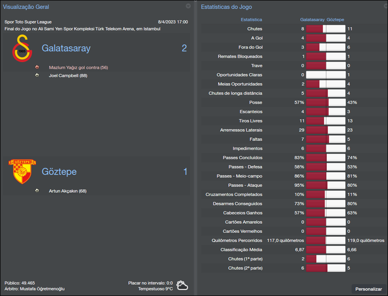 Foi contra o mesmo Manisaspor que o mês teve sequência, mas com rodadas pela Super Lig. Depois de outra vitória sobre esse adversário tivemos que enfrentar uma pedra no sapato do Goztpe: o Çaikur Rizespor. Depois de três empates seguidos, voltamos a vencê-los por 2 a 0 com gols marcados nos 10 minutos iniciais da partida.