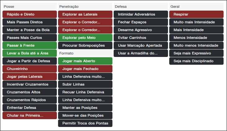 Adoto alguns gritos para facilitar o trabalho da equipe nessa formação, quero que a equipe privilegie o jogo pelo centro do gramado, que evite chutes de longa distância e que os passes em profundidade sejam mais frequentes. Essas instruções são fundamentais, mas posso usar outras se julgar necessário, desde que não atrapalhem o objetivo de chegar ao gol pelo meio-de-campo com troca de passes entre os meio-campistas e o atacante e com passe em profundidade para quem chega de trás. Nada que retarde a fluidez da troca de passes deve ser usado. Um detalhe importante é que geralmente eu uso a mentalidade controlar nesse momento.