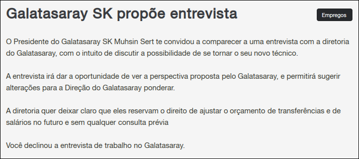 Gostei de ter cumprido o contrato mais uma vez e agora estou curioso para saber o destino do treinador. Pelo que você citou na postagem acima, desconfio que o alvo seja o Galatasaray. Mas como será para Kemel Demir treinar o time que ele mais odeia? Imagino que seja o time que ele mais odeia. Caso Kemel não aceite trabalhar no rival do seu time do coração, você se arrepende de ter citado o Fenerbahçe como o time do coração do treinador, justamente por isso ter fechado uma porta num país onde são poucos os clubes grandes? Essa pergunta tu pode responder após anunciar o novo emprego. Quais tu considera grandes na Turquia? Mais alguém além dos dois times já citados? E está disposto a passar quanto tempo esperando um emprego bom?