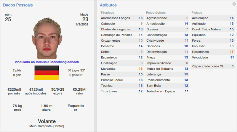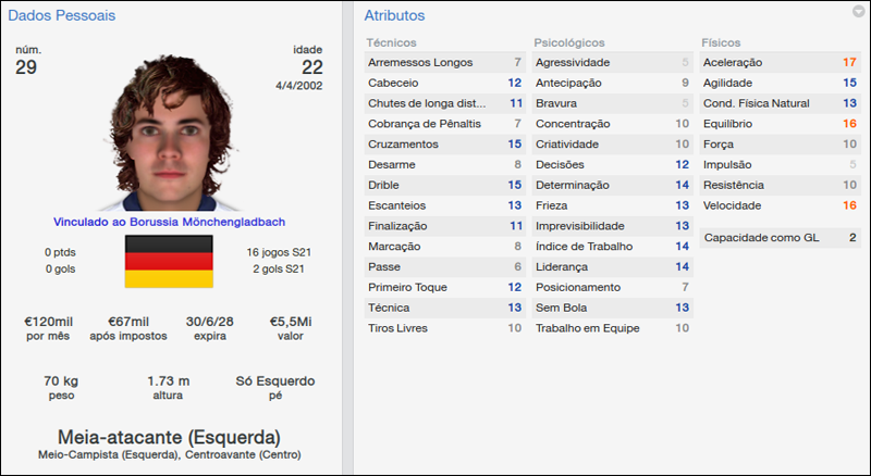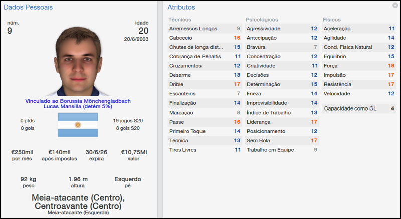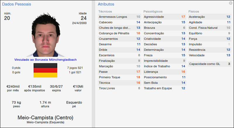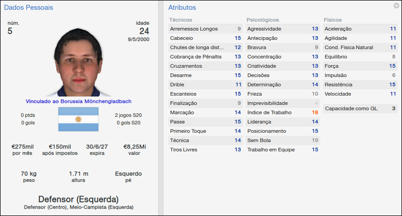 No ataque outra unanimidade, o argentino Tomás Leguizamón. Natural como meia-atacante e atacante, Leguizamón é preferencialmente meia-atacante e foi assim que ele jogou 24 das 30 partidas que o Borussia fez na temporada 2023/24, antes da chegada de Demir, com 12 gols, 2 assistências, 4 MeC e média 7,17. Pela ausência de atacantes qualificados, decidi que no 4-1-4-1 e no 4-3-3, ele seria o atacante da equipe.
