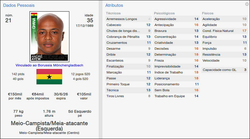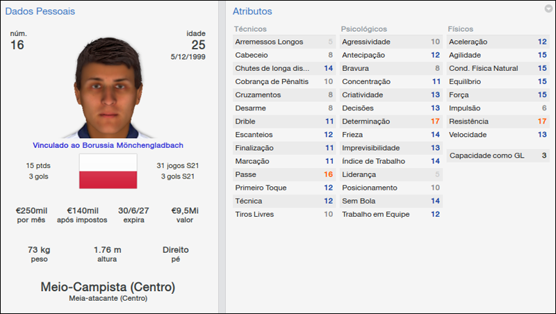 Para os meias externos no meu 4-1-1-1 eu não tive problema até mesmo porque não tinha muitas opções. Para o lado direito a opção era o brasileiro com o nome do antigo ponta da década de 70 e 80 do Juventus e Corinthians, Ataliba. Do lado esquerdo a posição era do alemão de origem italiana Daniele Cardillo. No lado esquerdo, optei por colocar Cardillo como Meio-campista Lateral (apoiar) para permitir que Elizari subisse ao ataque. Adicionei na função de Cardillo a opção Afunilar jogo. No lado direito, com Zucco fixo na defesa, coloquei Ataliba como Ponta (atacar) e com a instrução Mover-se da posições. Ao final, tudo funcionou bem. Ataliba fez 8 gols, 6 assistências, 3 MeC, média 7,15 e Cardillo fez 11 gols, 20 assistências, 6 MeC, média 7,47.