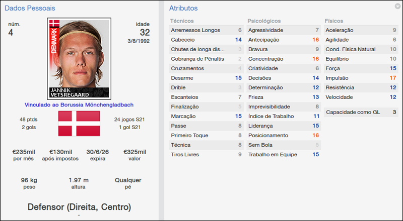 A temporada começou para valer em 5 de agosto e até 9 de novembro mudei o miolo da zaga em busca da dupla ideal. Joguei 14 partidas com sete duplas diferentes até encontrar a que melhor se encaixava e ela foi encontrada de forma inusitada. Pela velocidade e qualidade de passe, Eduardo Rodriguez sempre foi minha primeira escolha, mas quem surpreendeu foi o veterano Jannik Vestergaard, um dos favoritos do clube. Ele é natural como lateral direito e também como zagueiro, mas é preferencialmente lateral. Deixado de lado por mim na luta pela lateral direita, ele acabou recebendo uma chance na zaga e foi lá que se fixou ao lado de Rodríguez como titular, deixando os demais na reserva e jogando com média acima de 7.