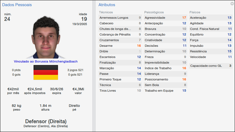 Se na esquerda não tinha dúvidas de quem seria o titular, na direita, o favorito à posição, o brasileiro Grafite, que também poderia jogar de Ala Completo, mas se mostrou propenso às lesões. No primeiro mês de Bundesliga usei três jogadores (Grafite, Jackson e Zucco), mas por conta da ofensividade de Elizari (lateral esquerdo) e também porque, segundo os relatórios, a maioria dos adversários fazia mais assistências pelo lado direito da minha defesa, optei por dar mais chances ao jovem Ezio Zucco, que possui características para jogar como um Lateral Limitado. Depois de três partidas abaixo de 7, ele engatou cinco partidas jogando acima de 7 e virou dono da posição.